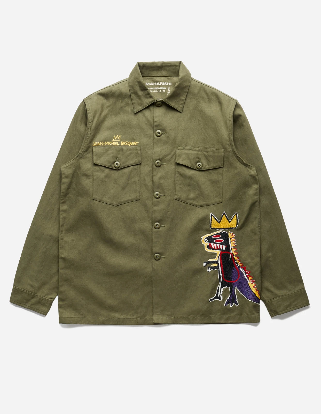 Garment dyed utility shirt, cut for a relaxed fit in mid-weight hemp twill. Large hand-machine embroidery of Jean-Michel Basquiat’s Pez Dispenser on front. Complete, with patch flap pockets and button closure.