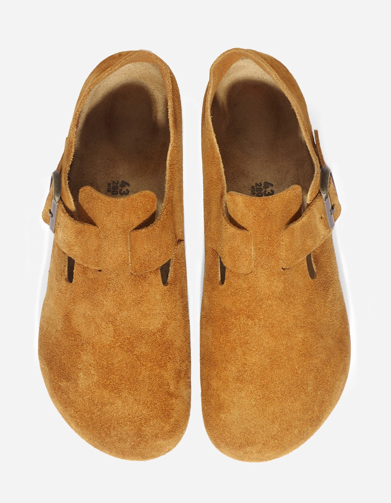 The Birkenstock London is a variation on the classic Boston. The raised heel section is characteristic of this simple low shoe with no stitching. It boasts a natural, rustic look and an open-selvage, unlined finish. The color-coordinated buckles with a textile feel and a matte design are additional eye-catchers. The upper is made from especially soft suede which hugs the foot like a second skin.