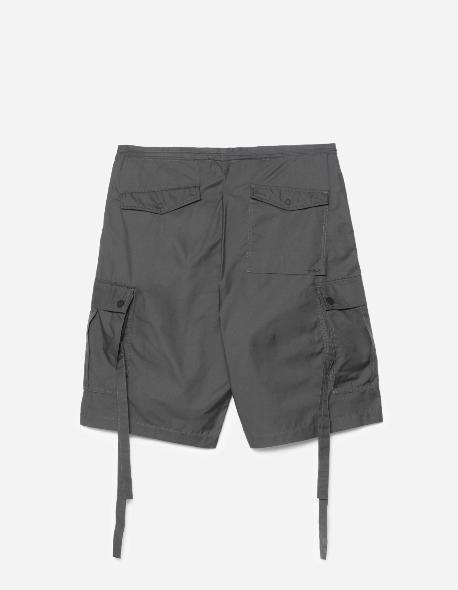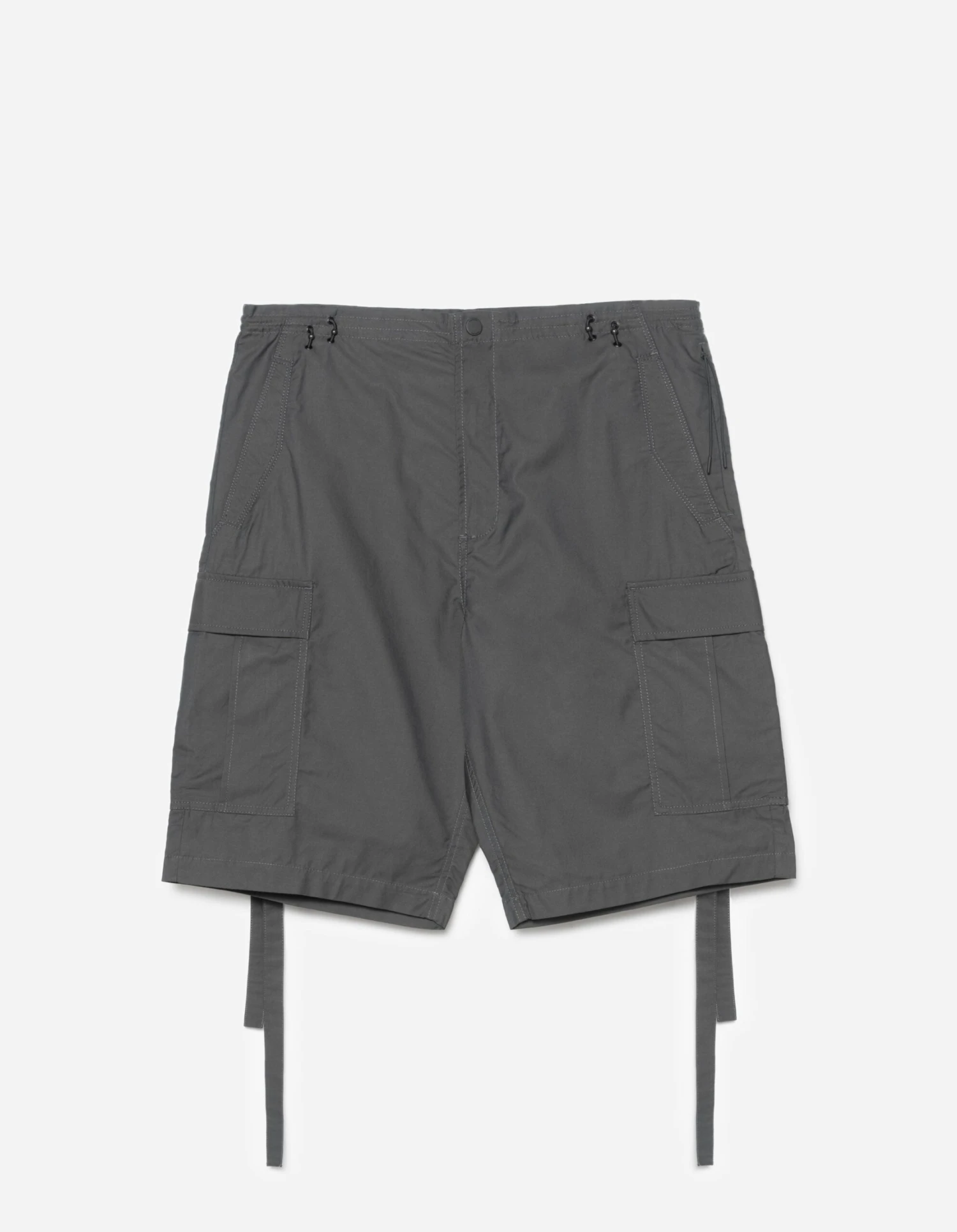 Loose fit cargo pocket shorts in charcoal, with Snocord waist for full fit adjustment. Cut knee length from an eco-conscious cotton/polyester blend. Featured from the original U.S. Army cargo pant, the leg straps were designed to be tied around the leg to secure the contents of the thigh pockets. These can optionally be concealed in the pocket by passing them through a small button hole.