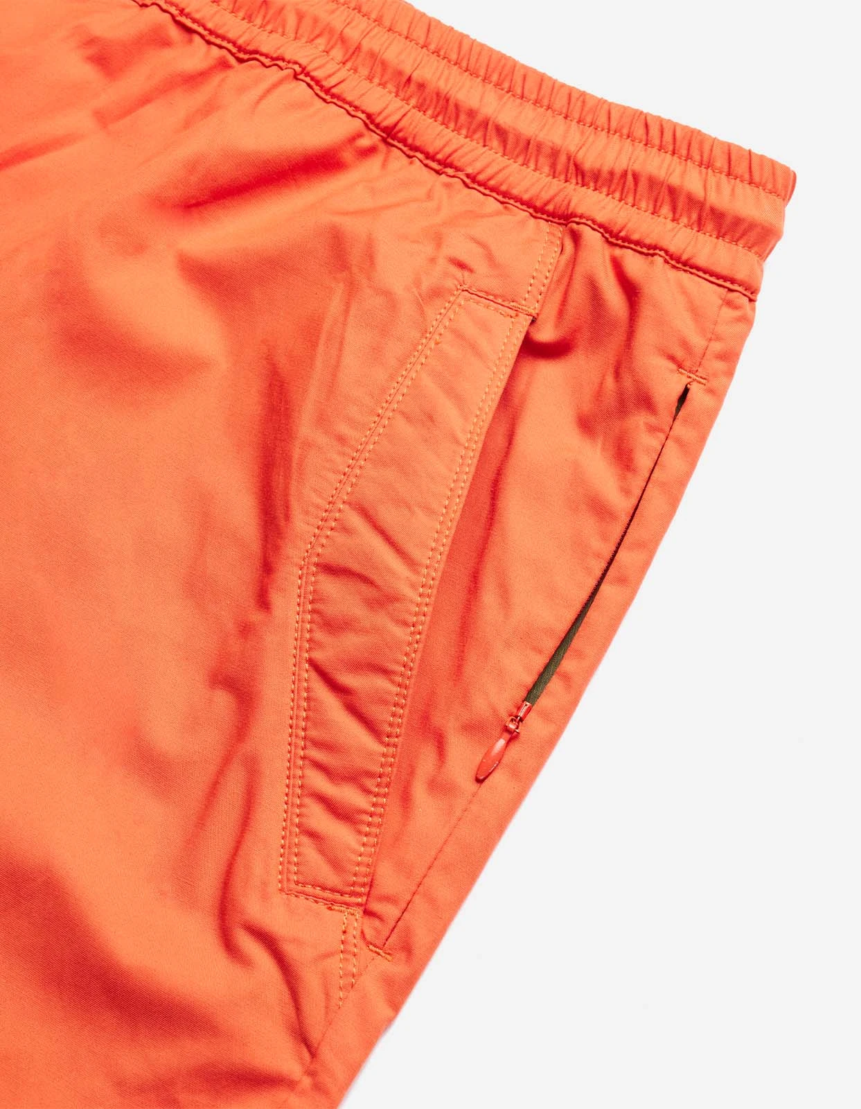 Orange lightweight track pants with a tapered, engineered leg shape to allow full knee motion, features a drawcord elastic waist and hems for a secure fit. Finished with an asymmetric mock fly detail.