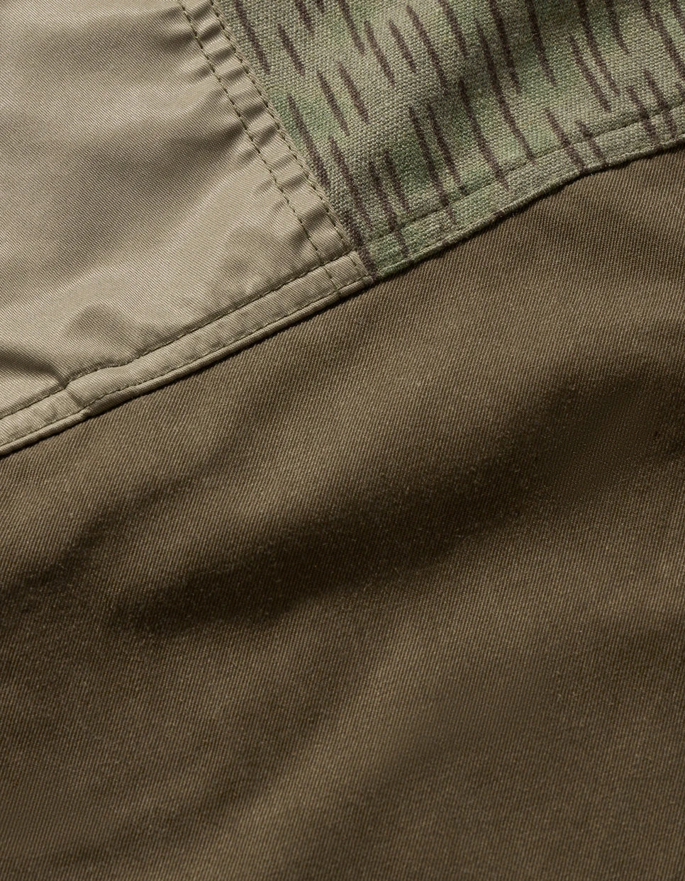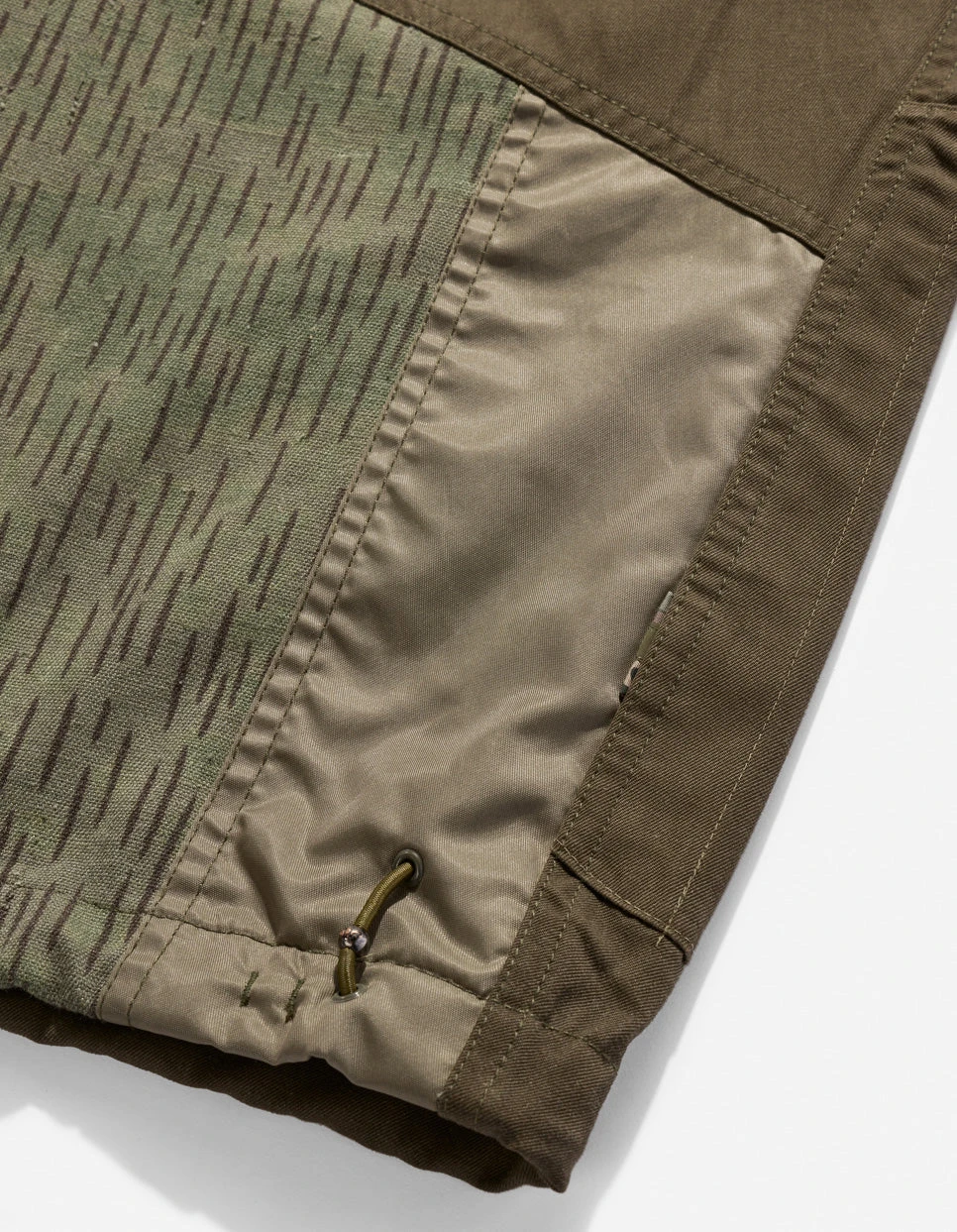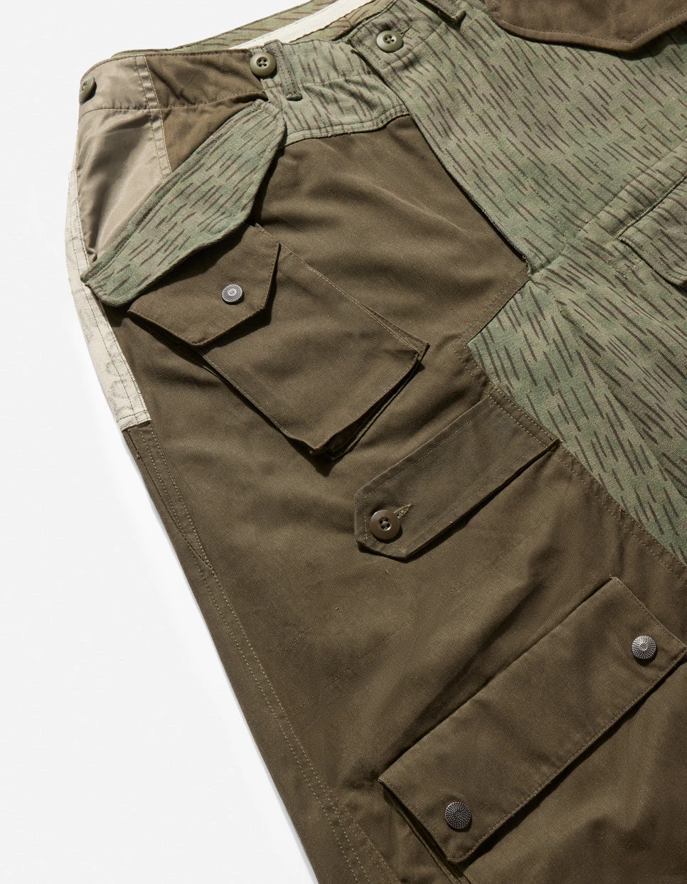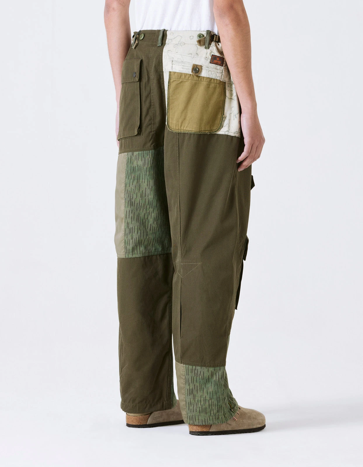 Olive cargo pants cut in a loose, wide fit. Taking cues from M65 MIL-SPEC cargo pants, constructed from a patchwork of Roma 75 jackets, Czech M60 Field Jackets, as well as reclaimed German Strichtarn DPM. Featuring an array of cargo pockets, finished with a Snocord® and temple bead hem for adjustment.
