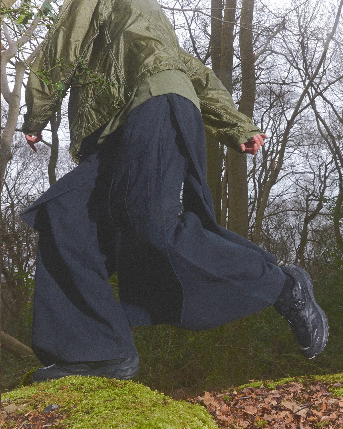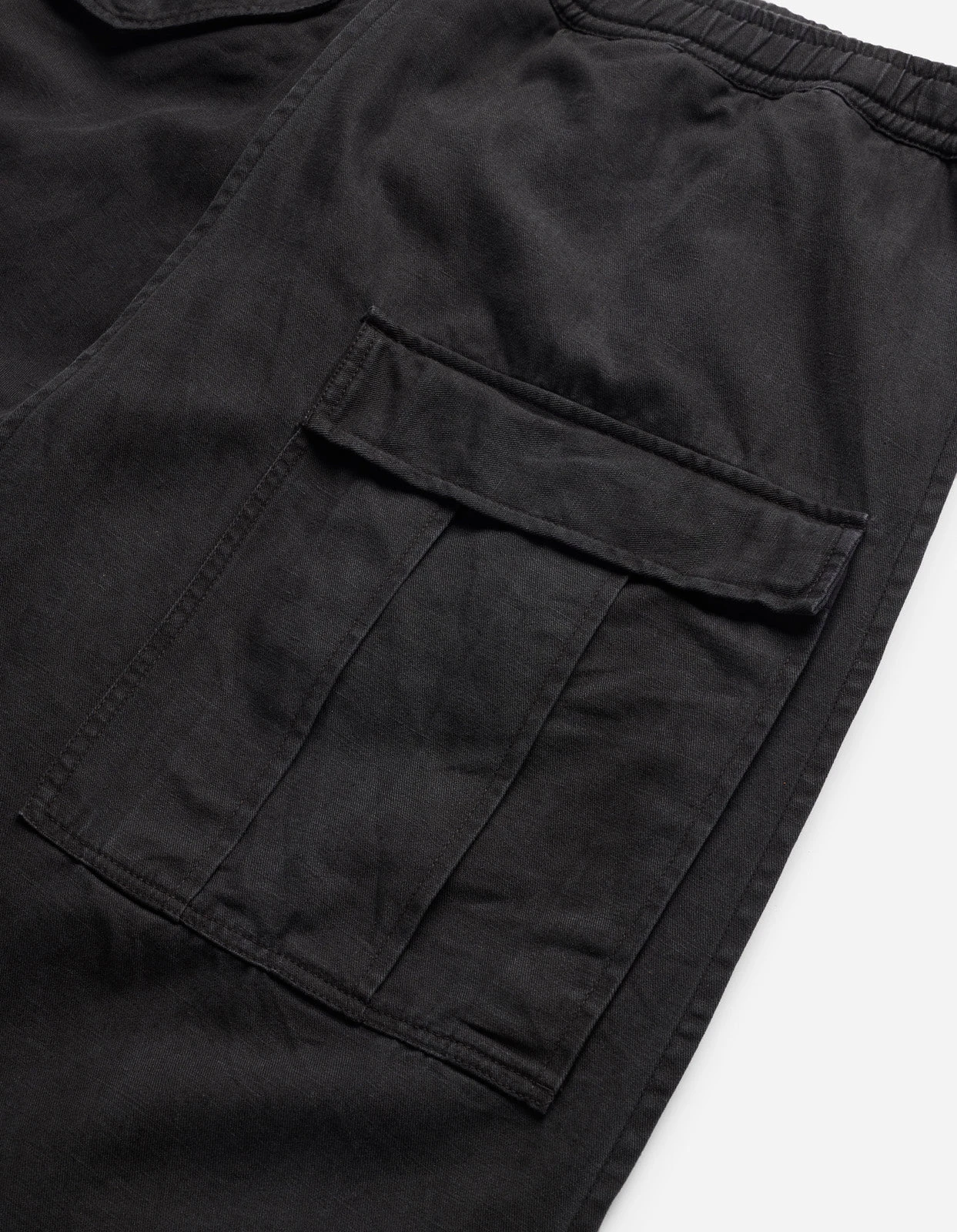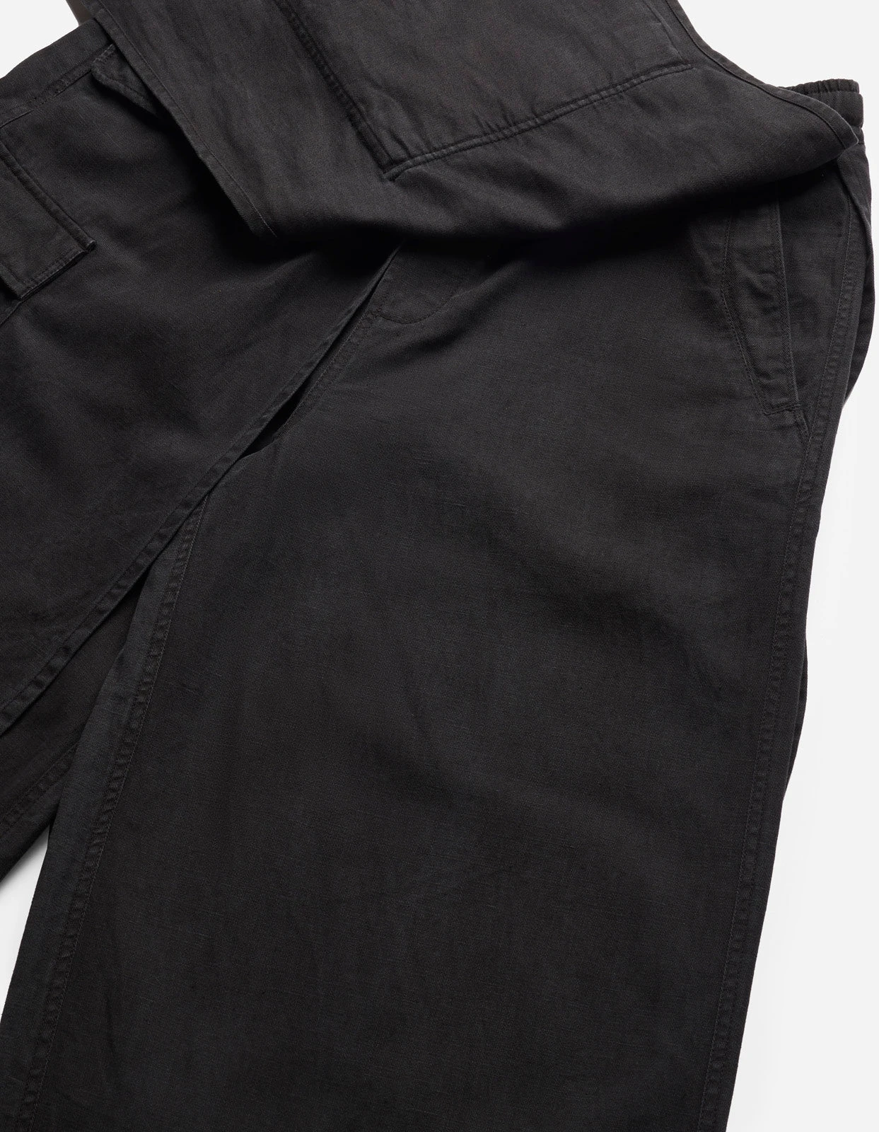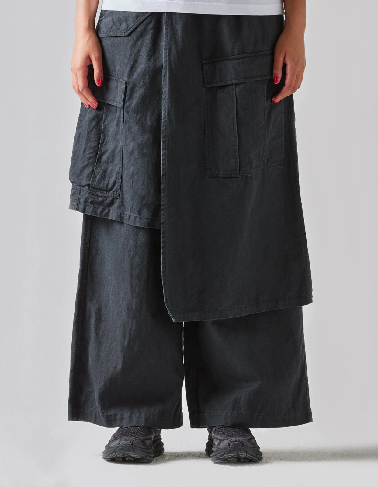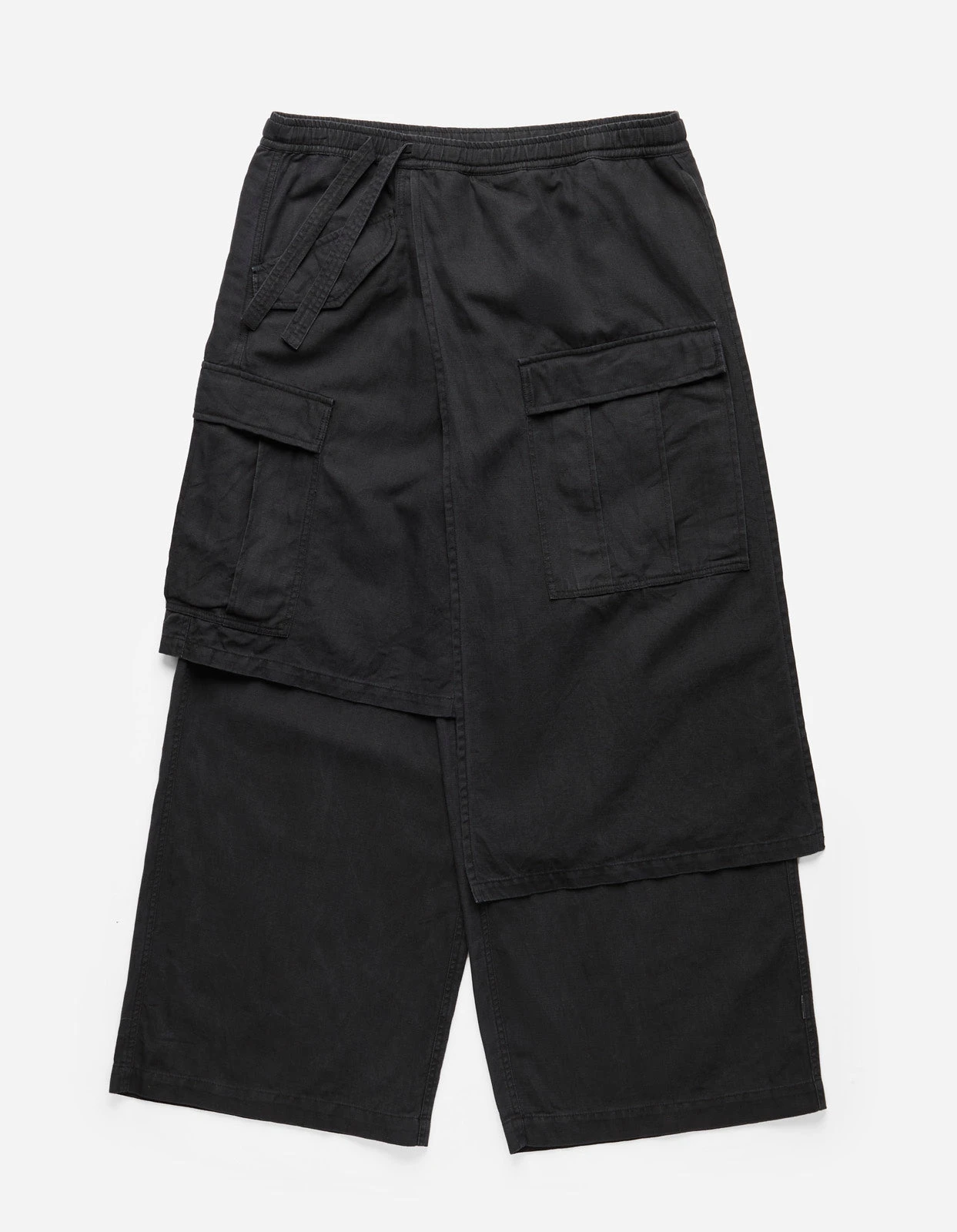Asymmetric wide leg cargo pants, with cargo skirt layer incorporated. Cut in a black midweight hemp/cotton twill.