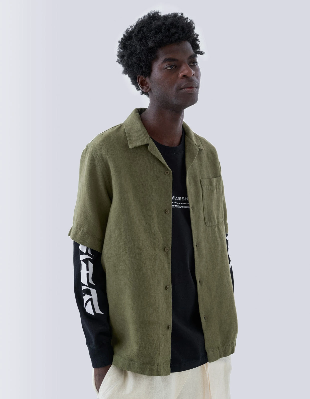 Relaxed fit short sleeve shirt with a double notched camp collar and patch pocket, made in a lightweight textured hemp