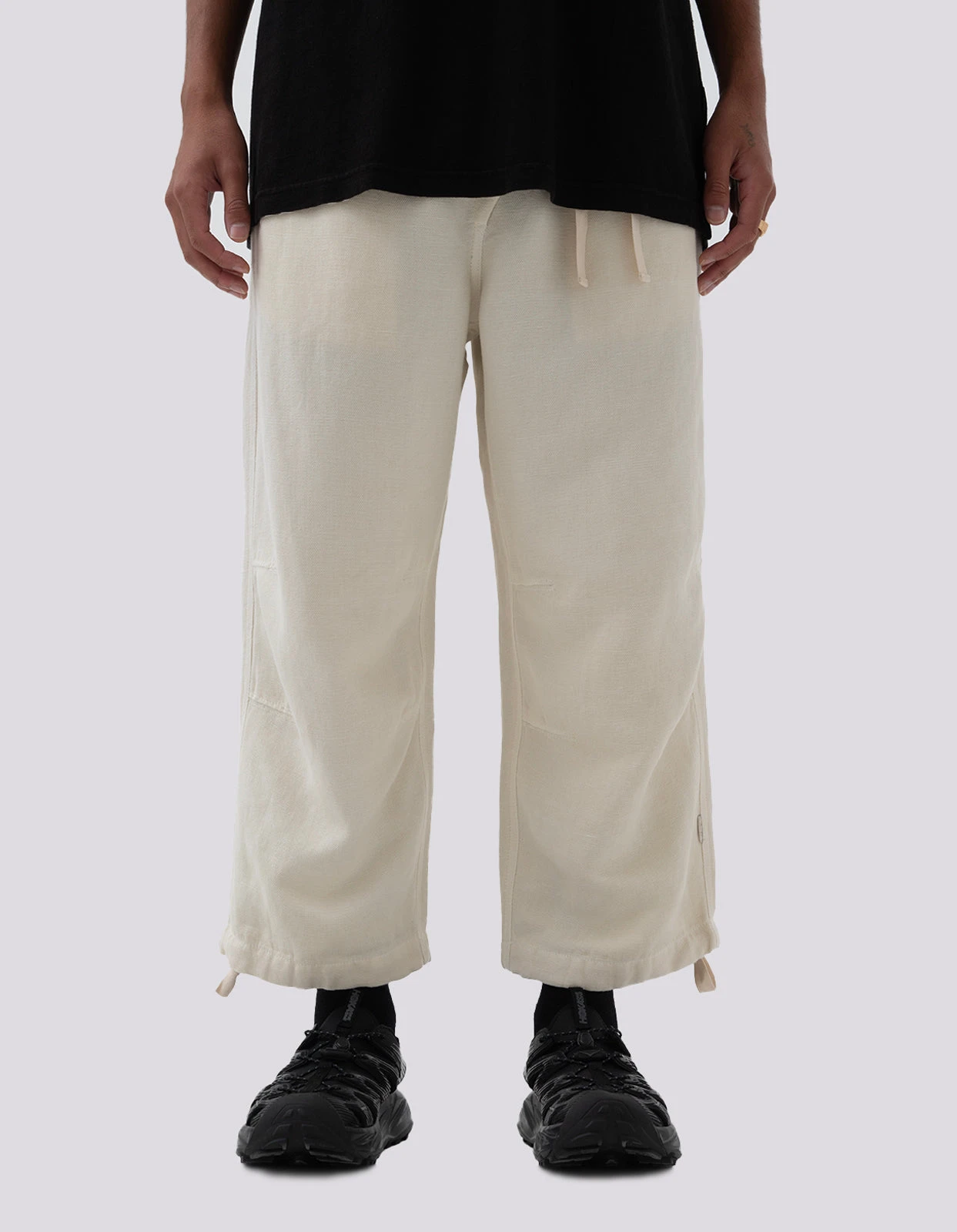 3/4 length track pants constructed from an eco-conscious hemp cotton canvas with drawcord waist and hems.