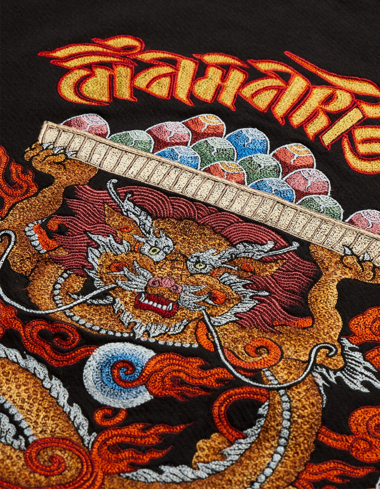 Crew neck sweater in black with a Tibetan dragon chest embroidery by guest artist Tashi Mannox to celebrate the lunar new year and 30th anniversary.