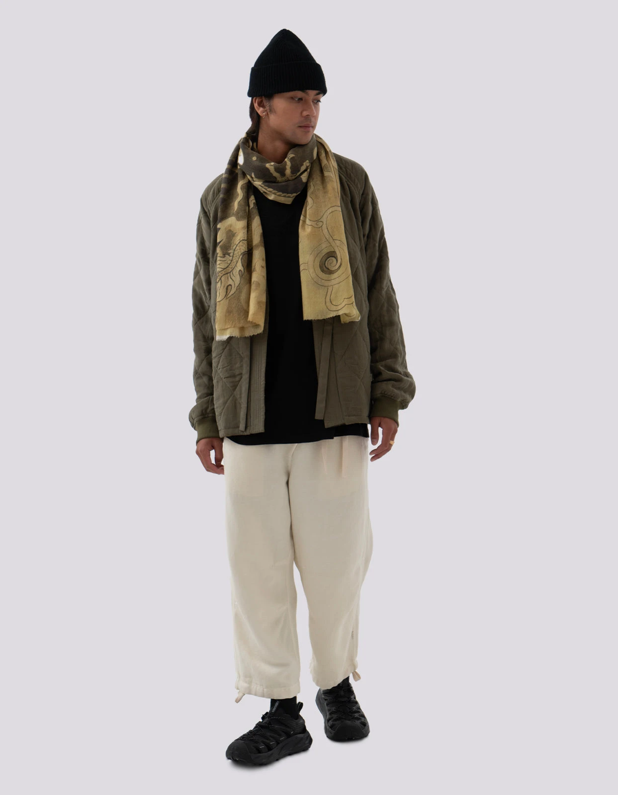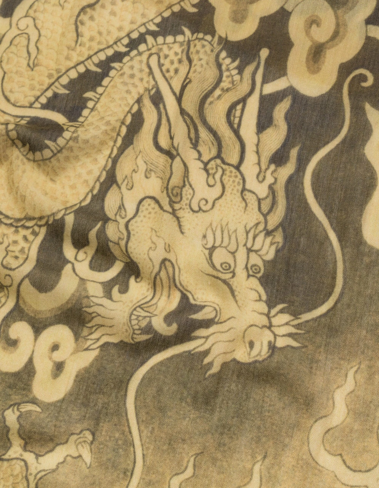 Large cashmere scarf, features an all over tonal dragon print to celebrate Maharishi’s 30th anniversary.