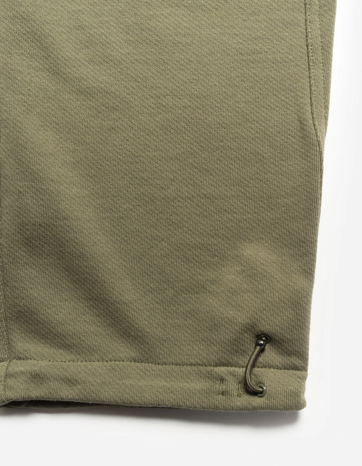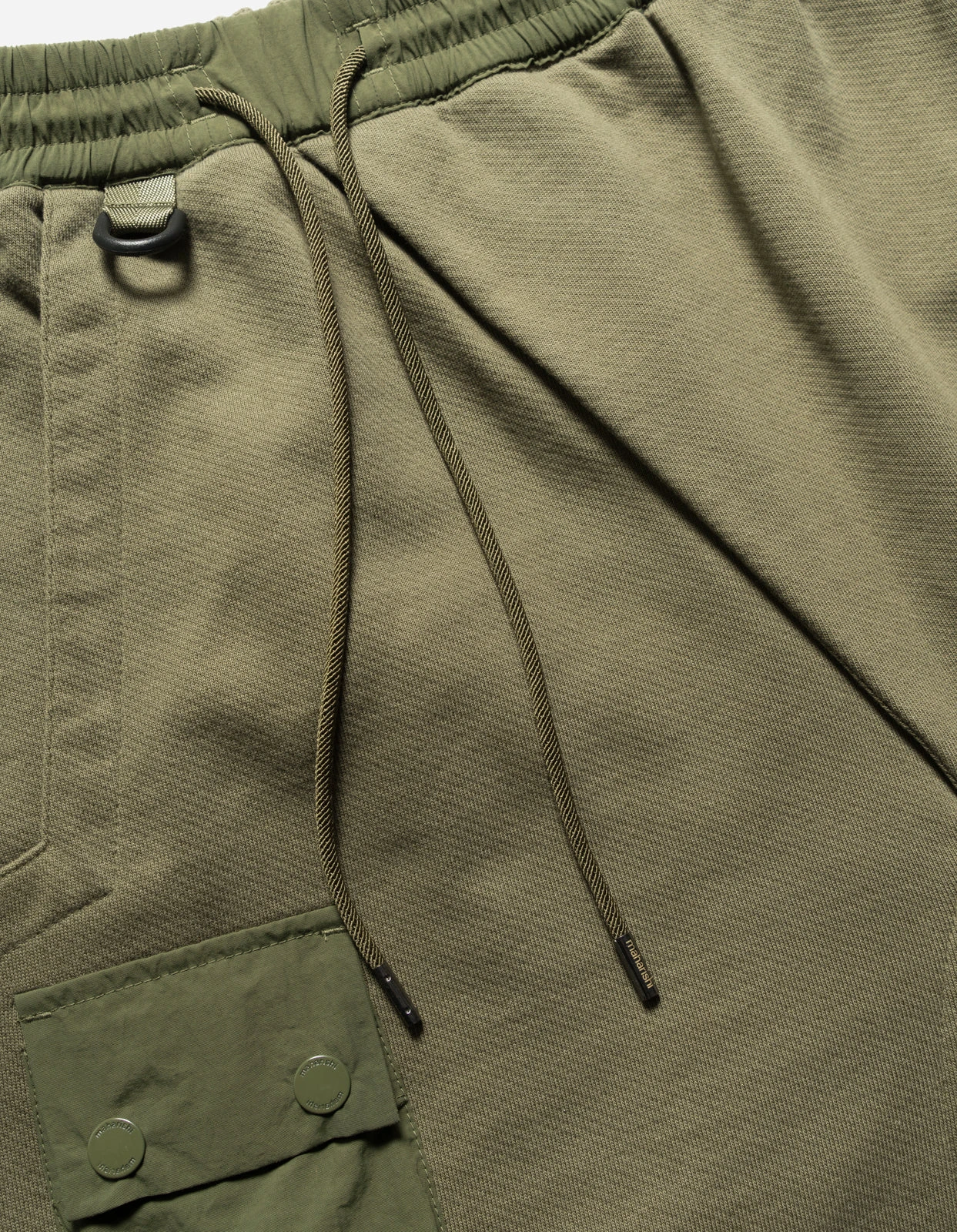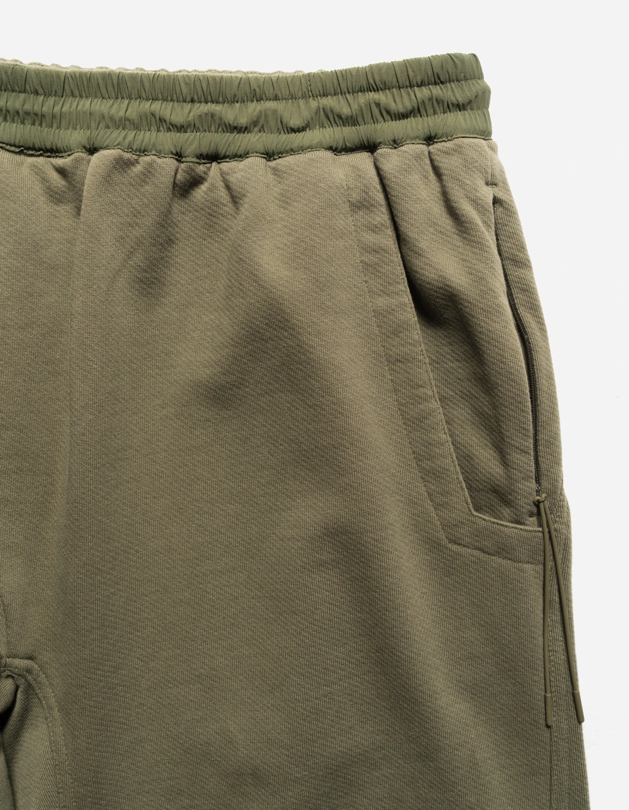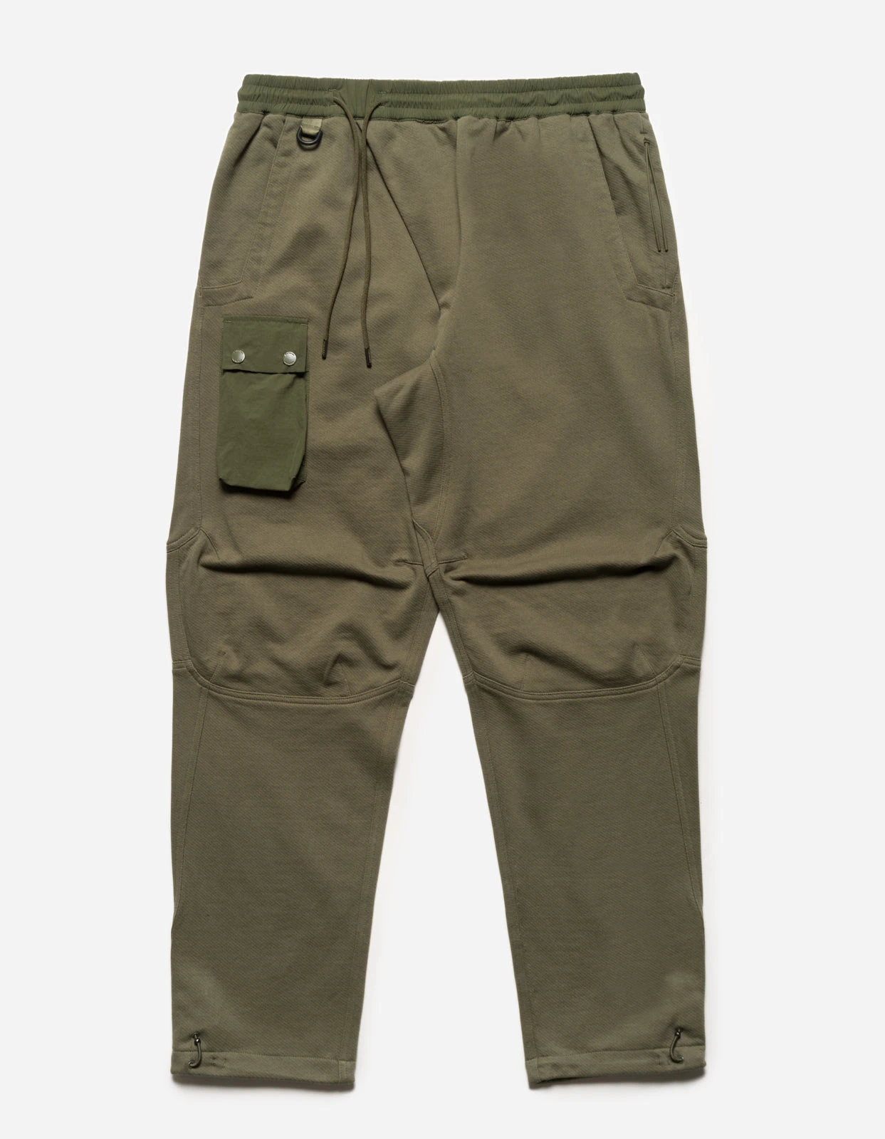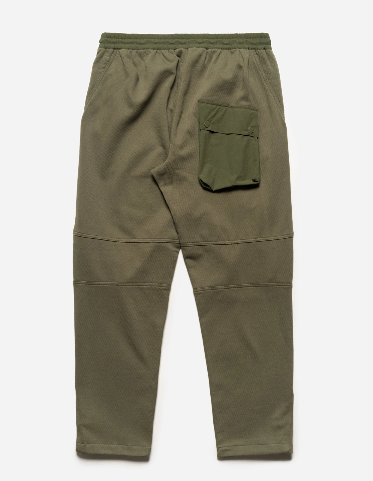 Olive technical sweatpants of cotton jersey featuring knee darts and overlaid patch pockets of recycled nylon.