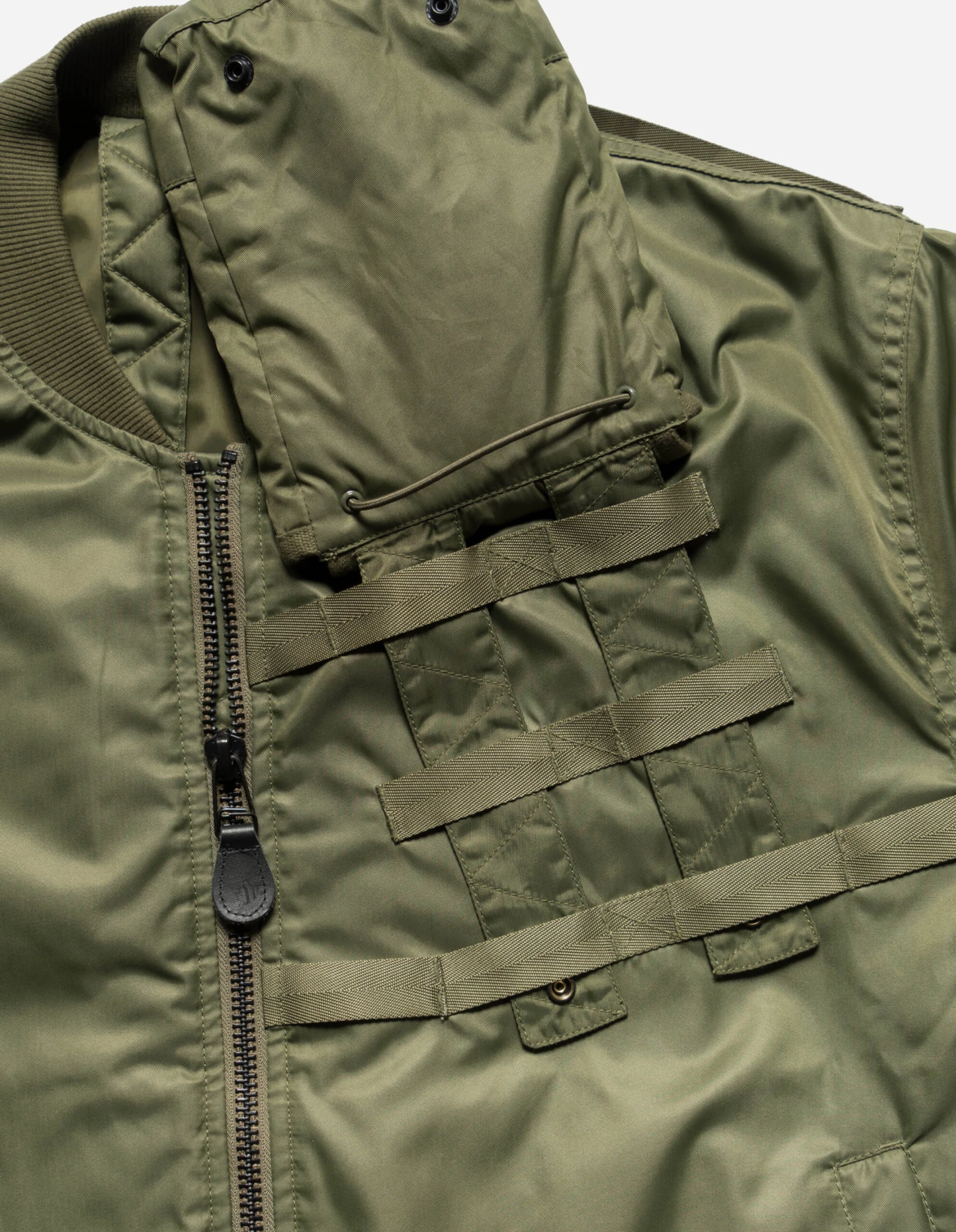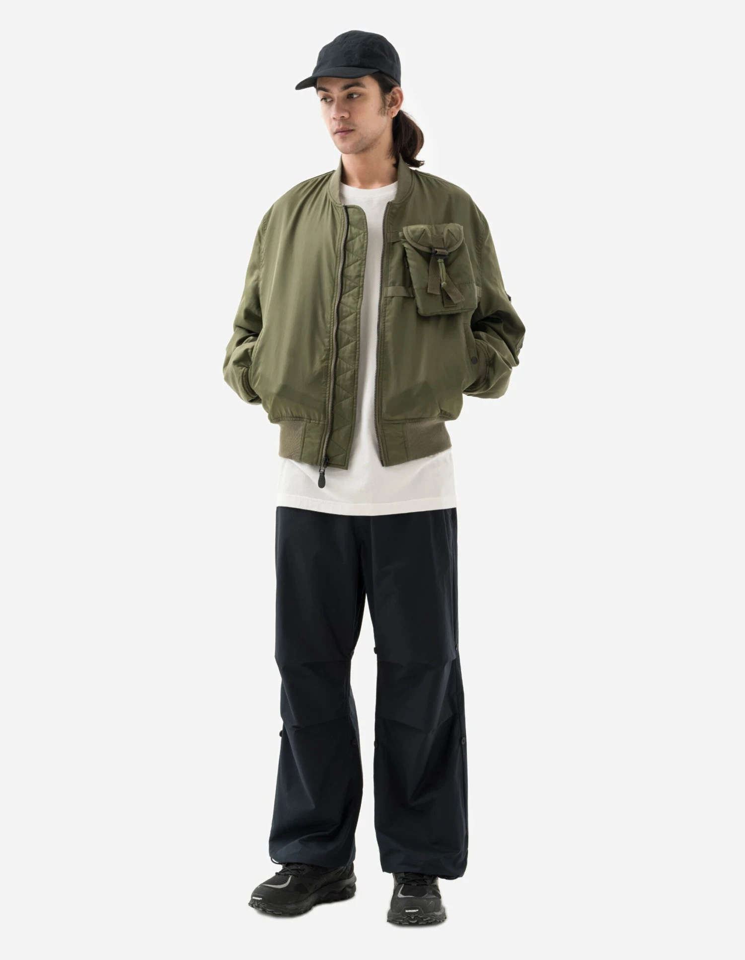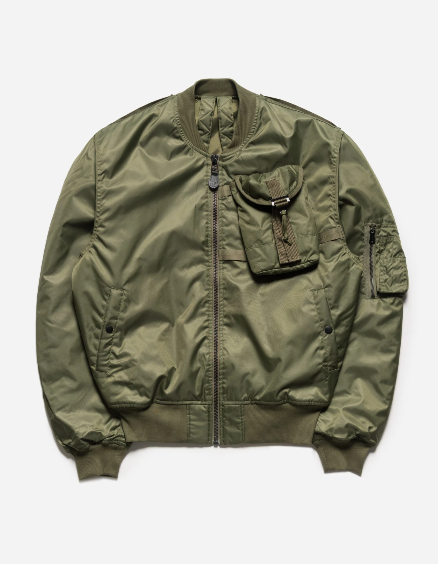 MA-1 flight jacket modified with a M.A.L.I.C.E type pocket at the chest that can be removed and worn as a bag. The jacket features the classic hi-vis lining, sleeve pocket and an offset two-way zip closure.