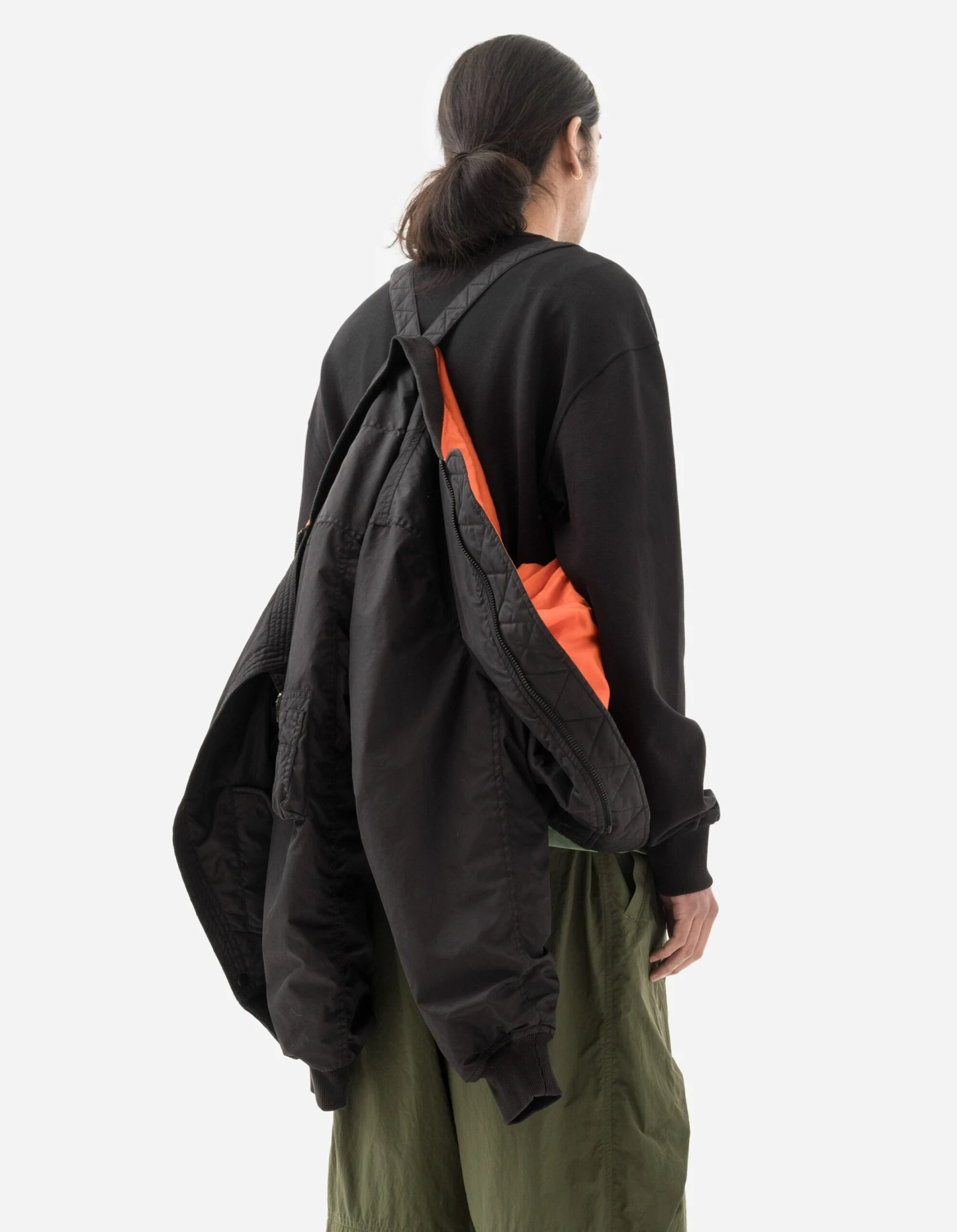 Classic MA-1 Silhouette with a Tibetan-inspired wrap around front closure. Crafted from a durable flight nylon that has been stonewashed for a matte finish, the jacket features ribbed trims, sleeve utility pocket and a hi-vis interior with carry straps.