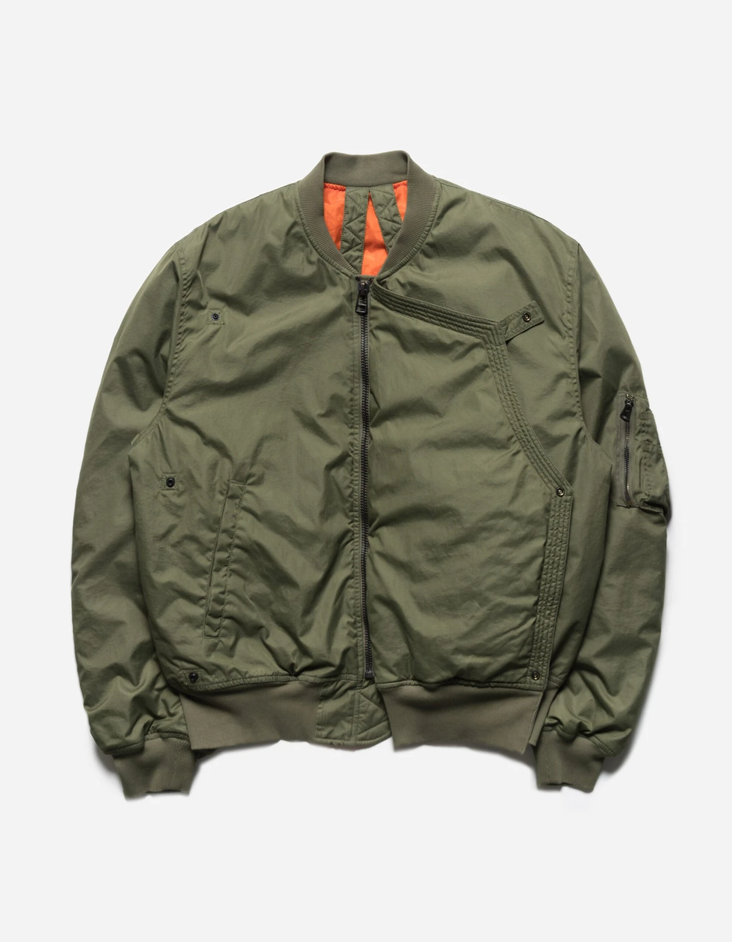 Classic MA-1 Silhouette with a Tibetan-inspired wrap around front closure. Crafted from a durable flight nylon that has been stonewashed for a matte finish, the jacket features ribbed trims, sleeve utility pocket and a hi-vis interior with carry straps.
