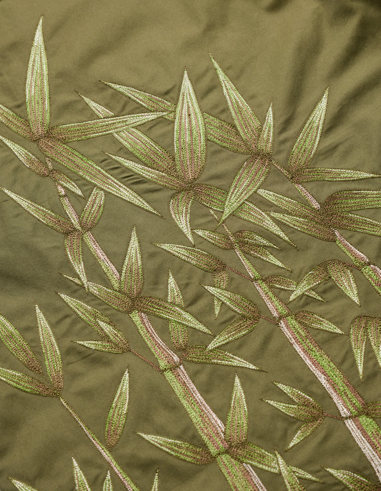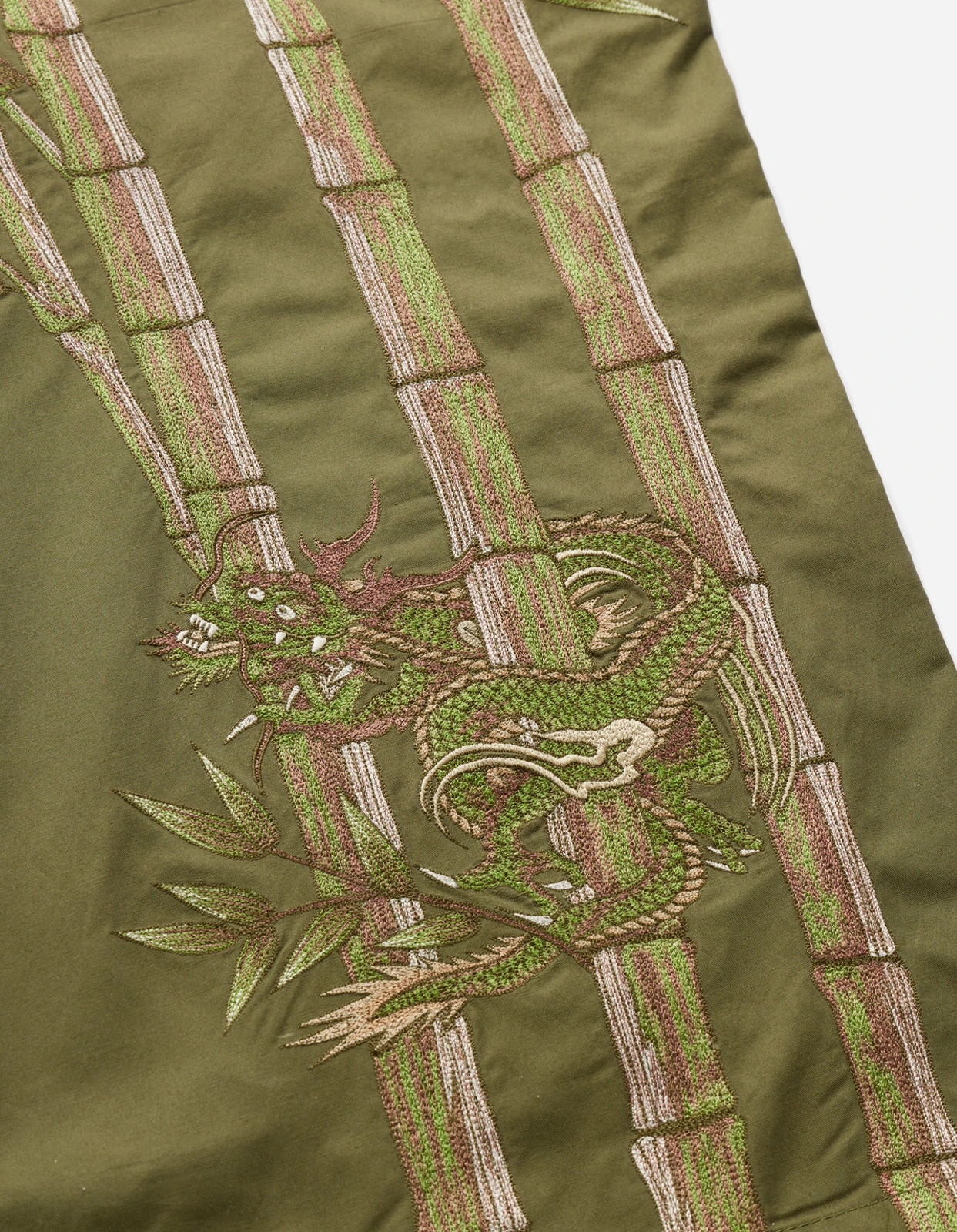 Loose fit Original Snopants feature an intricate Dragon Bamboo hand machine embroidery at the leg. Constructed from an eco-conscious organic cotton recycled polyester blend in olive.