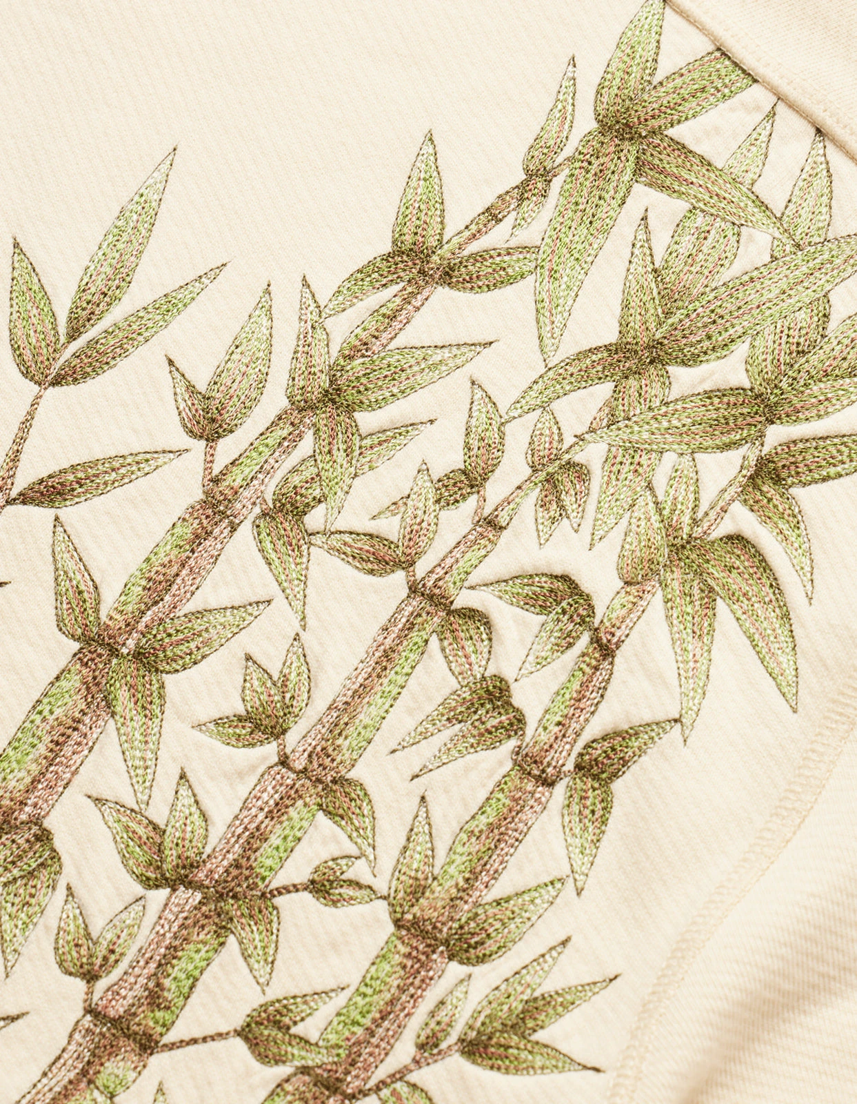 Dendrocalamus sinicus, also known as ‘Giant Dragon Bamboo’, is the largest bamboo known to man bearing the tallest and biggest culms of any known bamboo species. Hand-machine embroidered artworks further reference lucky bamboo, incorporating symbolism of flexibility, strength and resilience it is also commonly recognised as a Feng Shui sign which brings good fortune throughout the east.