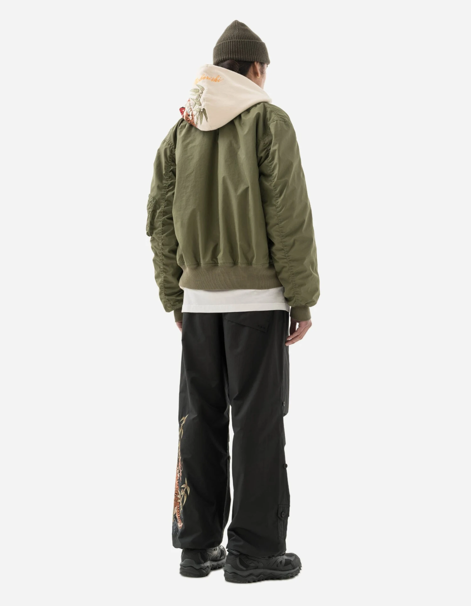 Loose fit Original Snopants® featuring an intricate hand-machine leg embroidery, depicting a tiger in a bamboo forest. Crafted from an eco-conscious organic cotton recycled polyester blend in black.