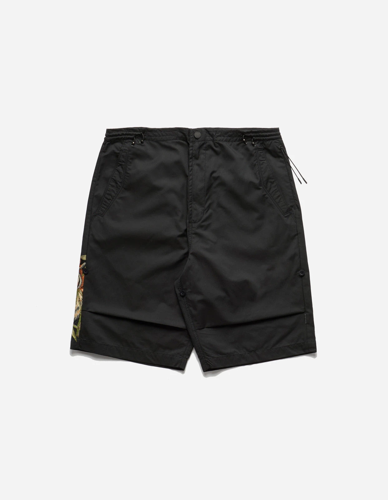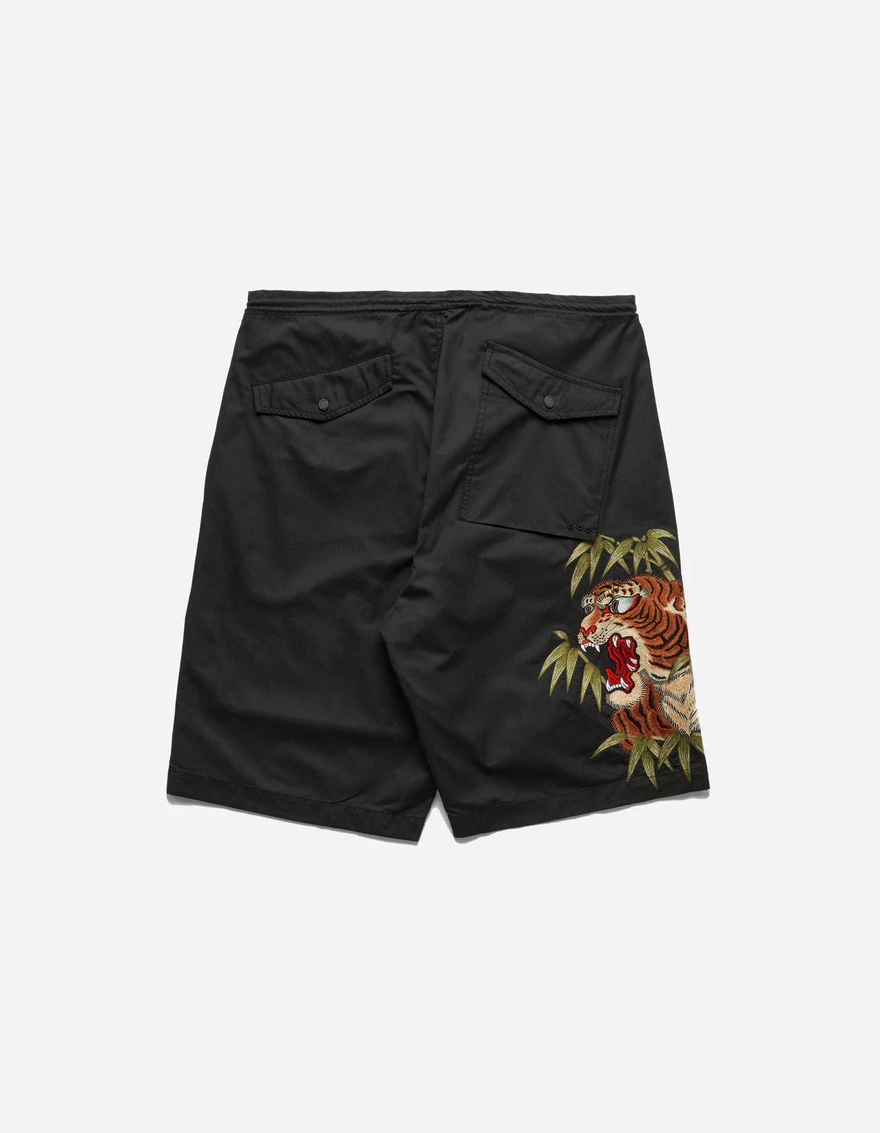 Loose fit Snoshorts with an intricate bamboo tiger head hand-machine embroidery at the leg. Crafted from eco-conscious organic cotton recycled poly blend in black. A tiger, a symbol of determination, is said to be one of the few species able to negotiate its way through a bamboo forest. The animal becoming one with the dense branches represents a harmonious society.