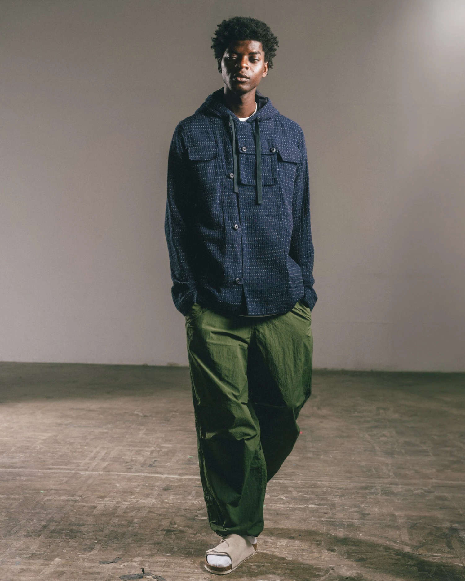 Smock parka, based on a West German military design fitted with a centred chest pocket, and overlap buttoned placket reconstructed in a indigo dyed Kantha cotton.