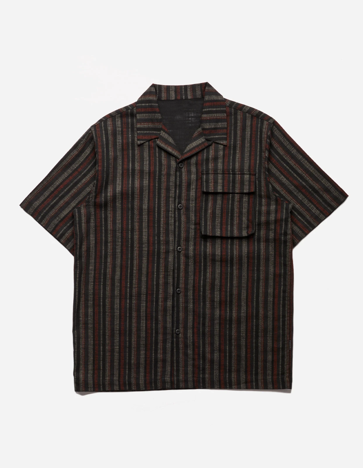 Lightweight shirt, constructed from a Japanese woven striped cotton with a casual open camp collar and chest patch pocket.