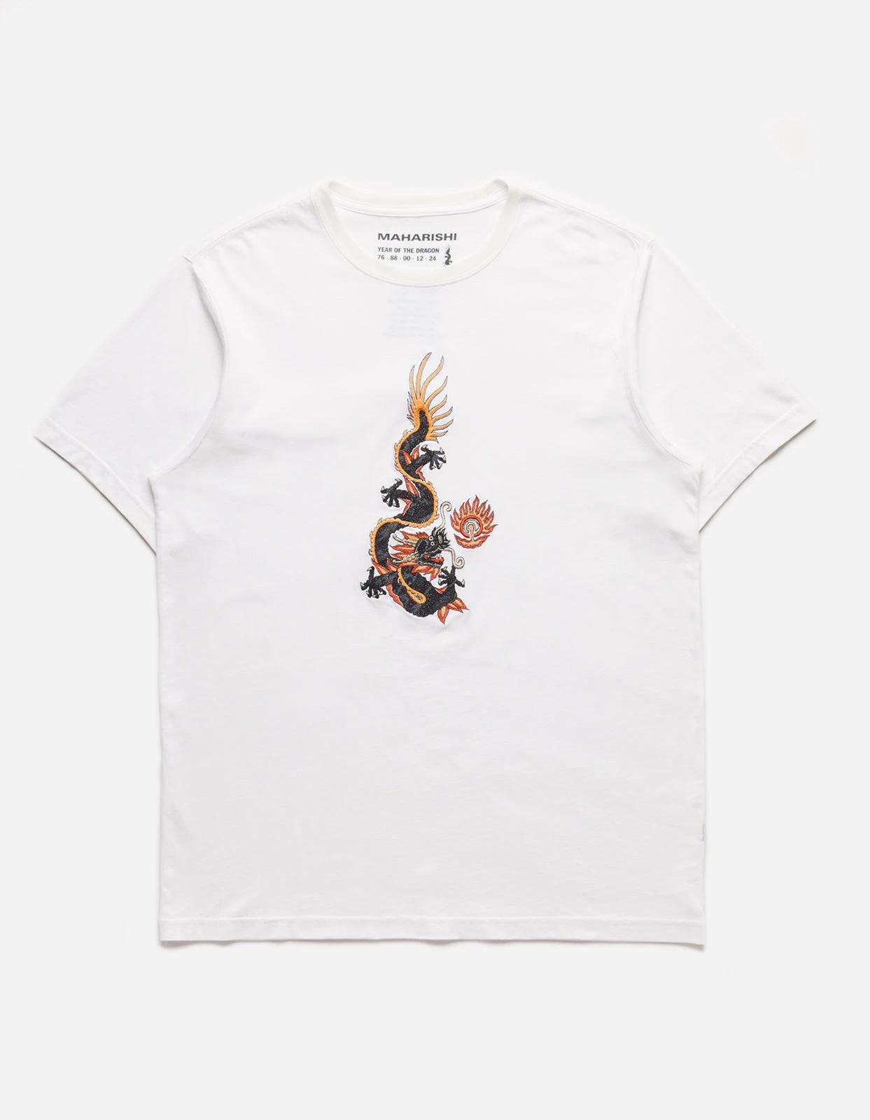 Short sleeve tee features Maharishi’s Original Dragon in hand machine embroidery at the chest.