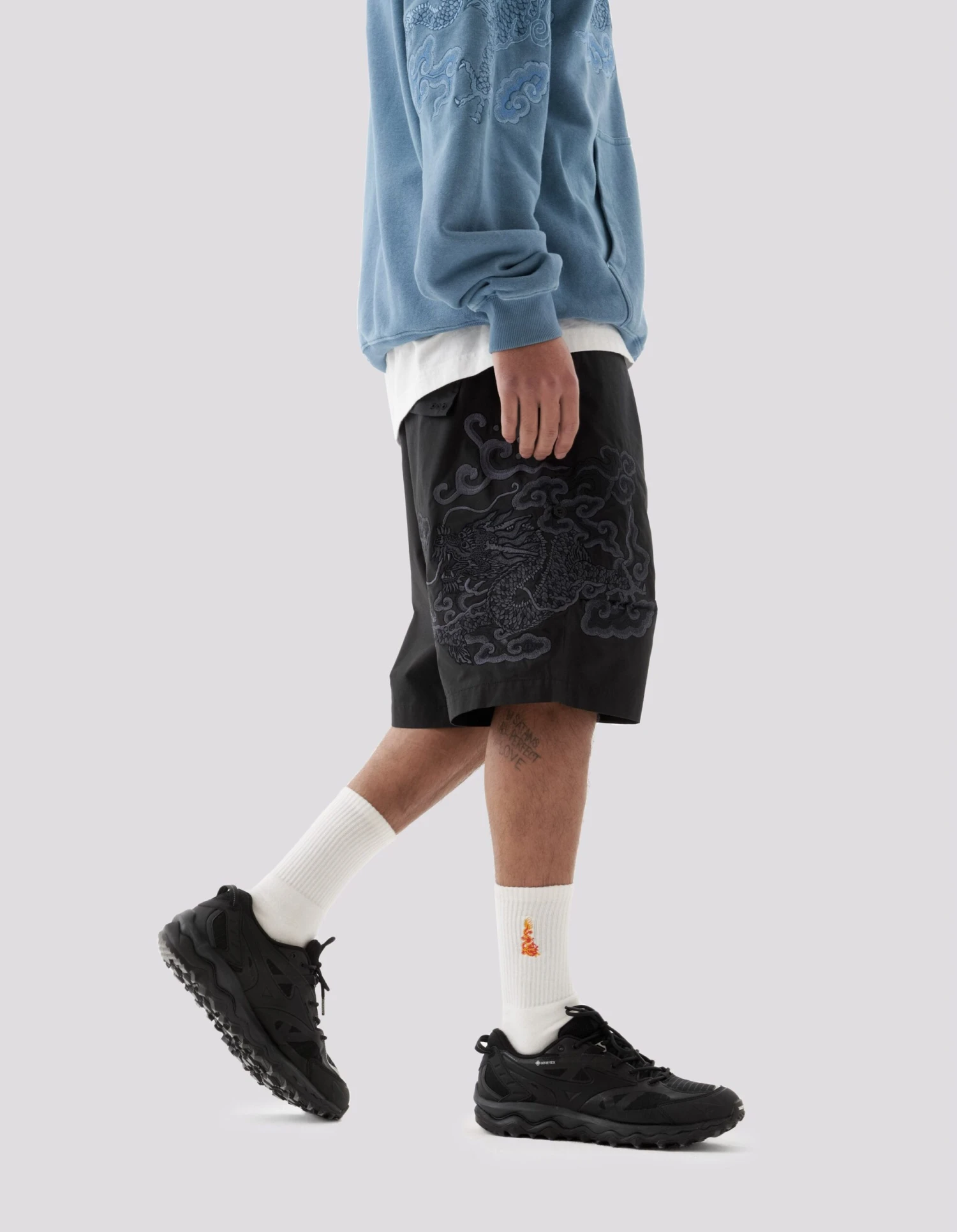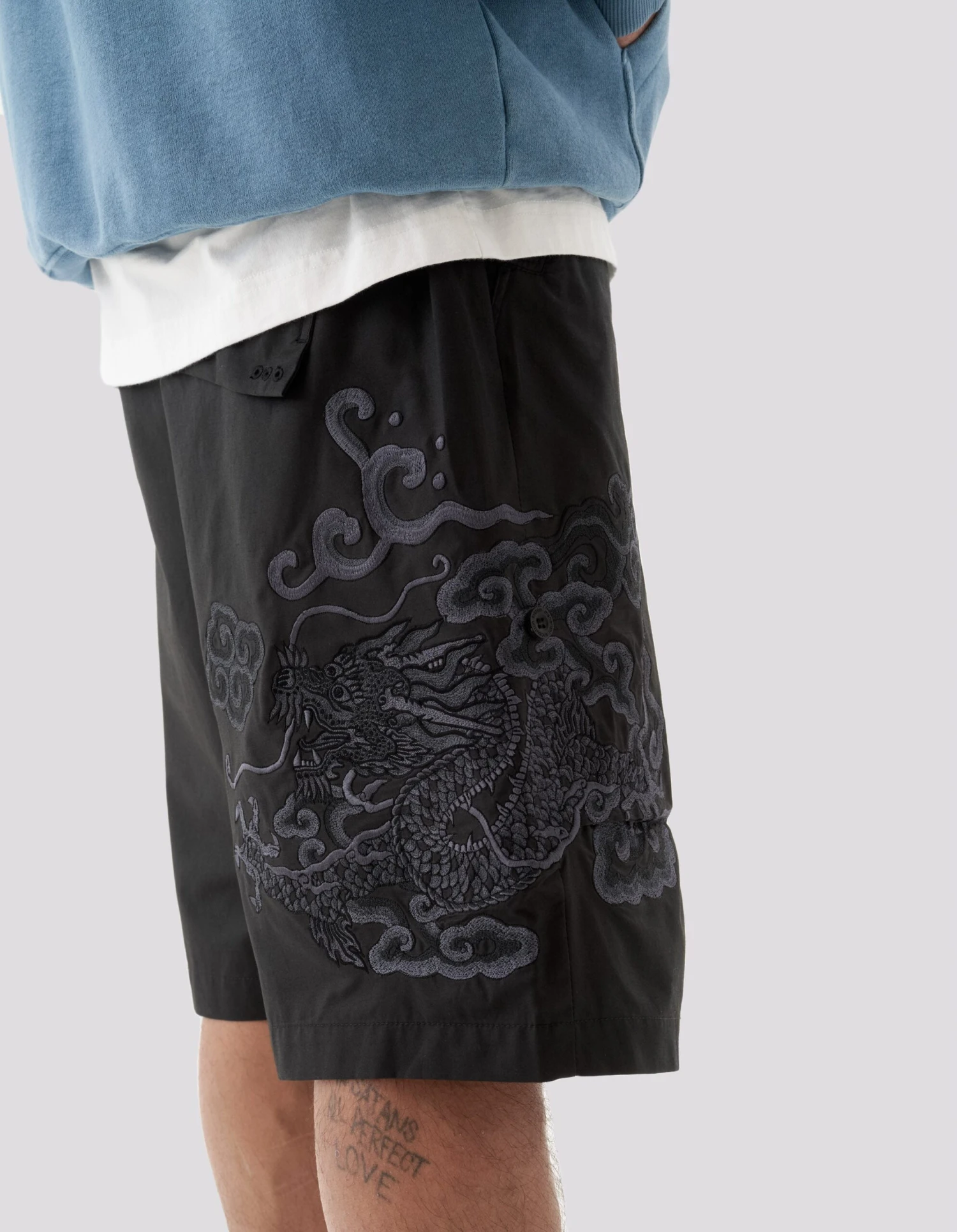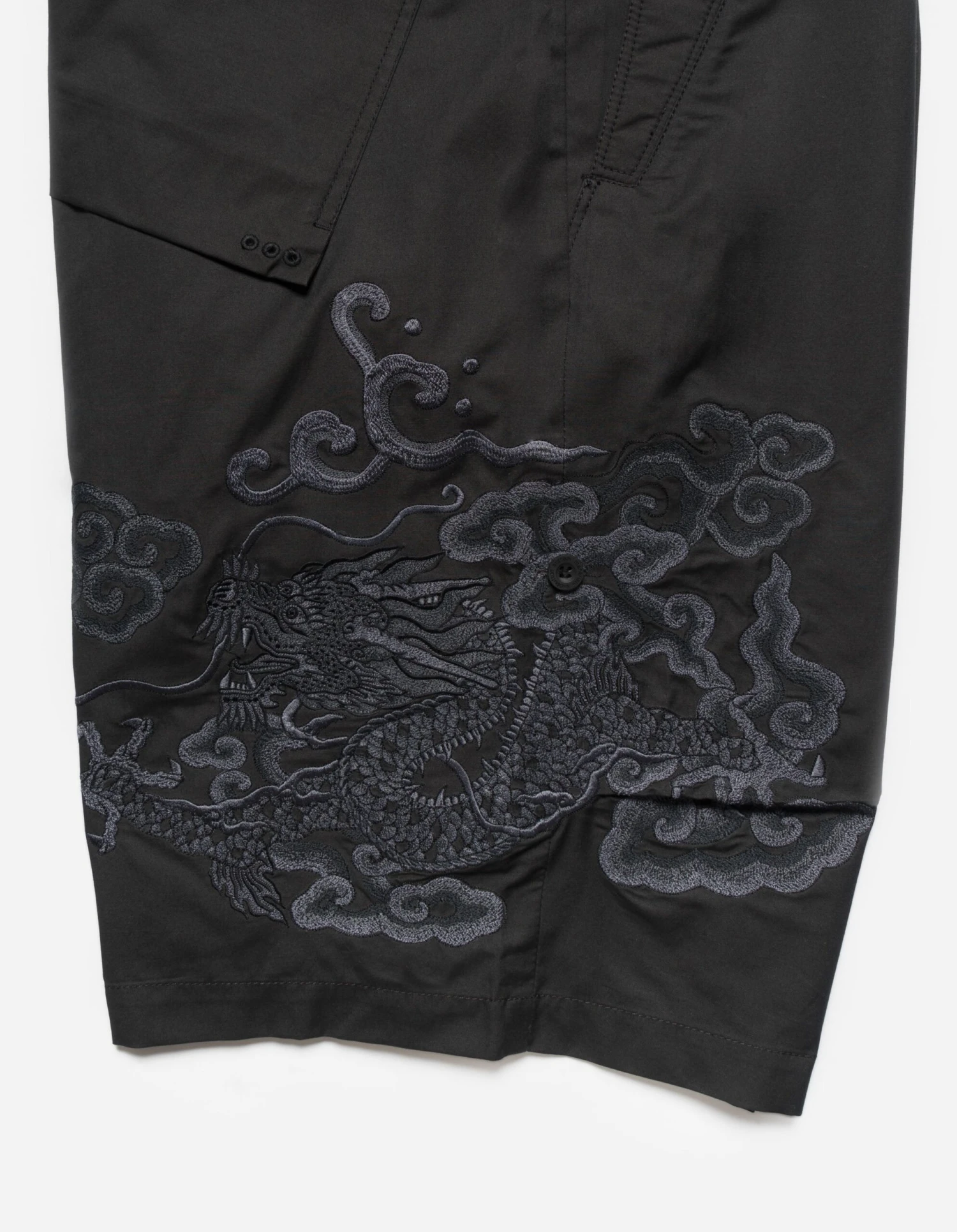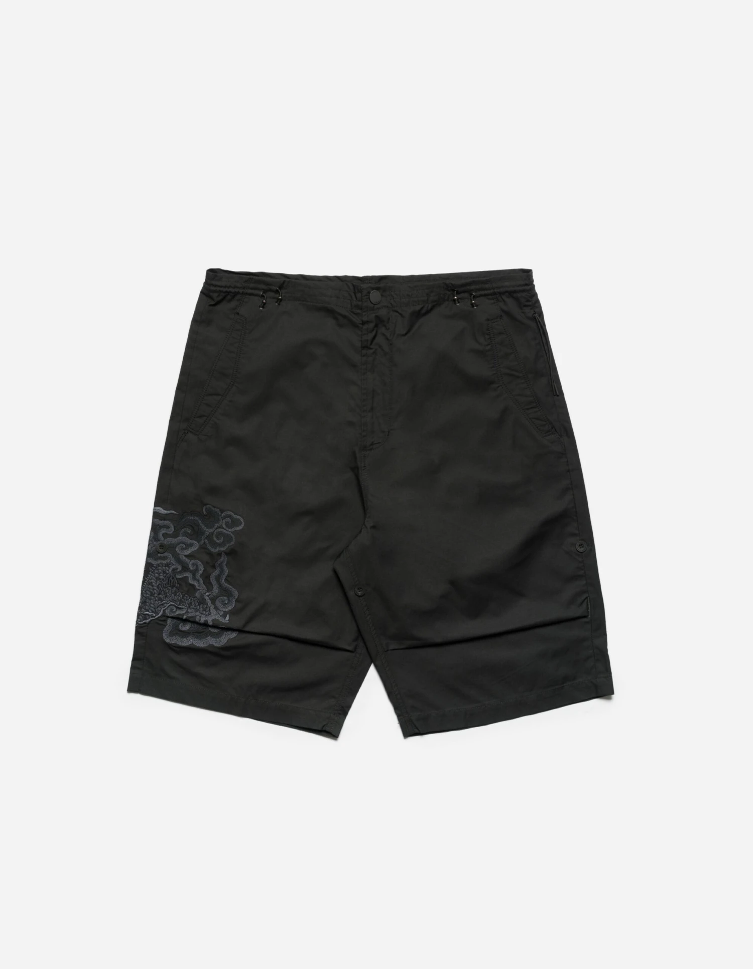 Loose fit snoshorts® feature a hand-machine embroidery by guest artist Tashi Mannox. An intricate dragon artwork is surrounded by heavenly Tibetan Thangka style clouds, celebrating the Lunar New Year that coincides with Maharishi’s 30th Anniversary.