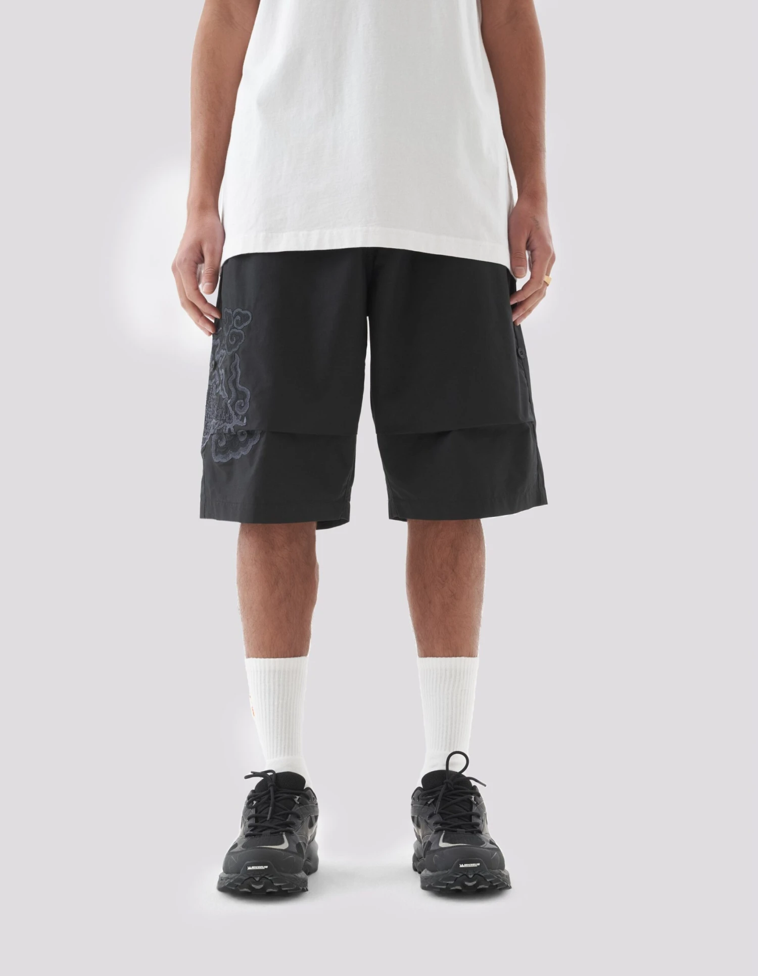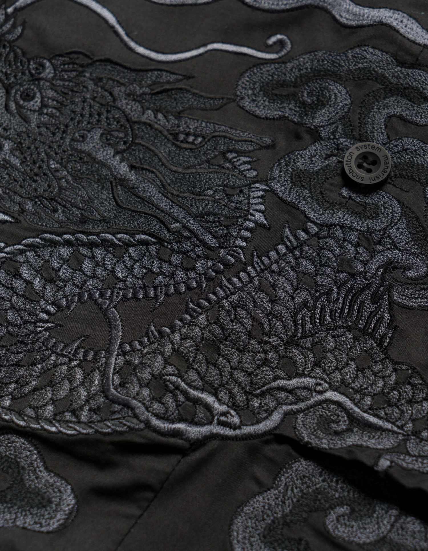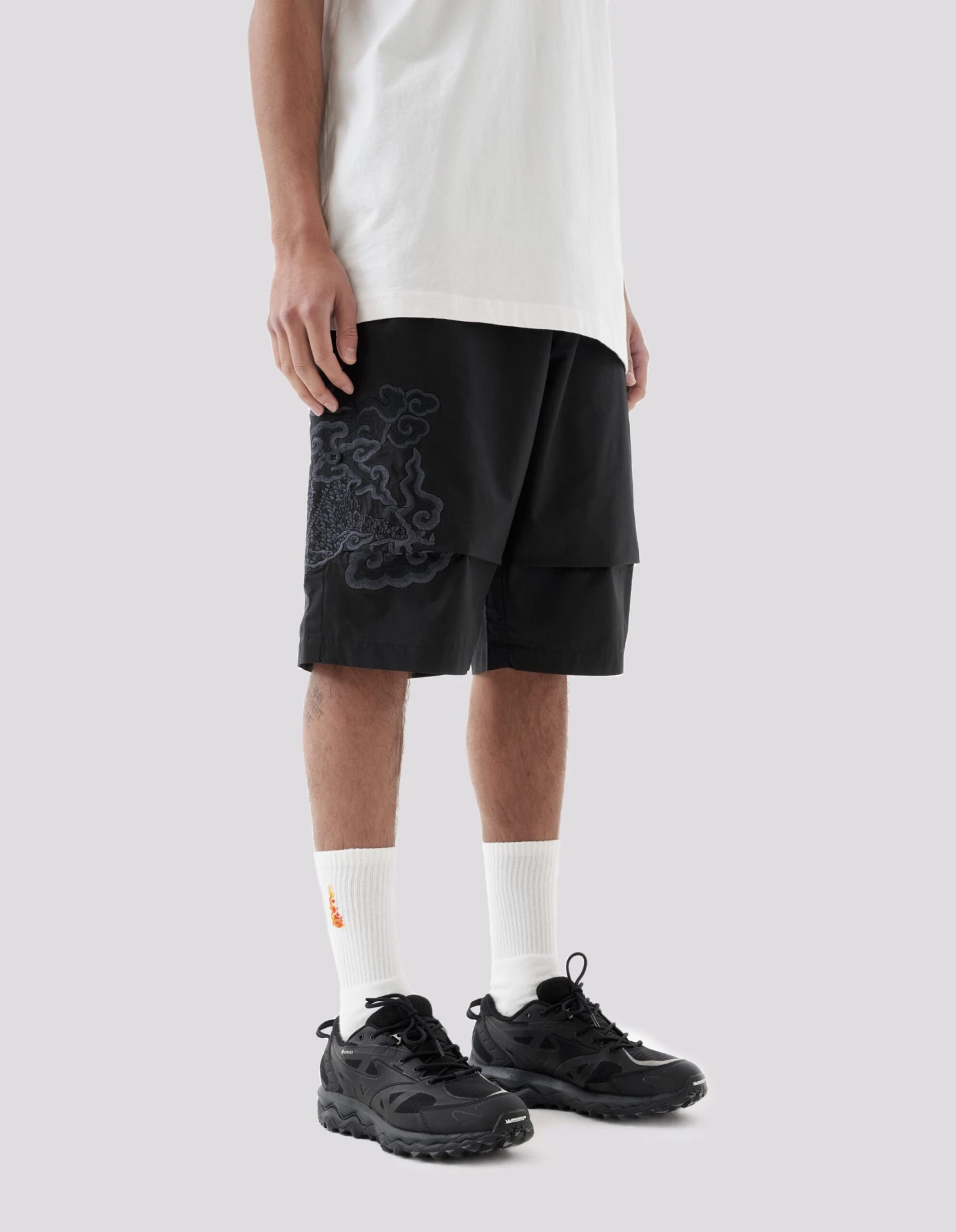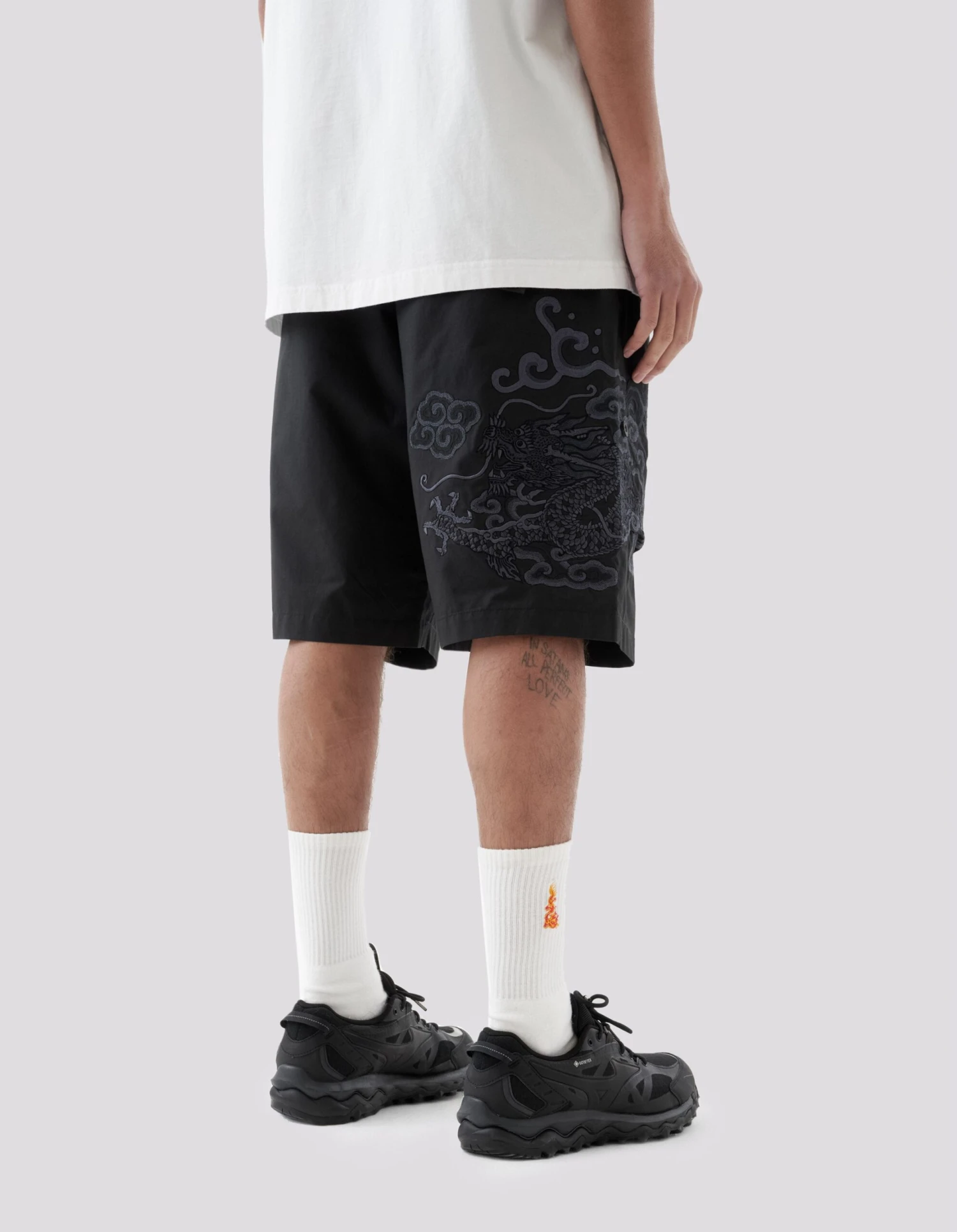 Loose fit snoshorts® feature a hand-machine embroidery by guest artist Tashi Mannox. An intricate dragon artwork is surrounded by heavenly Tibetan Thangka style clouds, celebrating the Lunar New Year that coincides with Maharishi’s 30th Anniversary.
