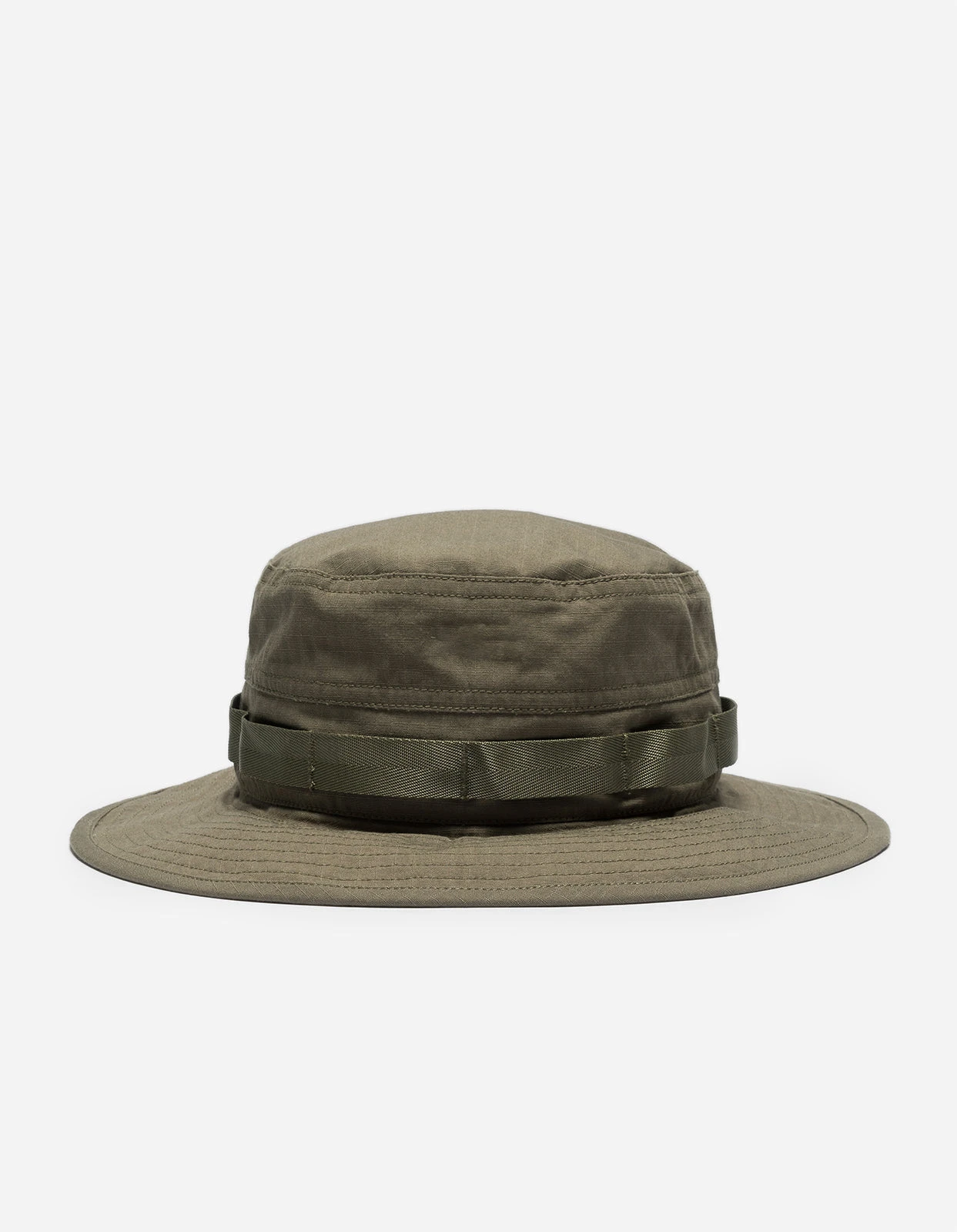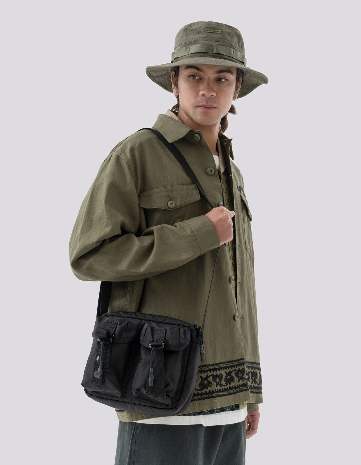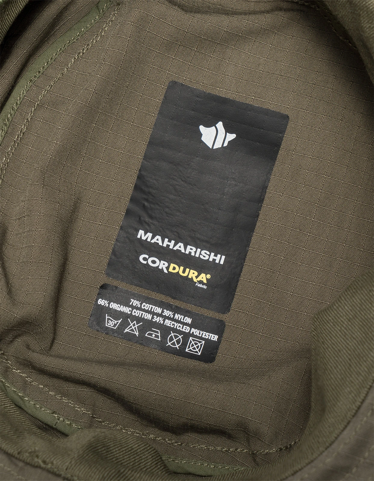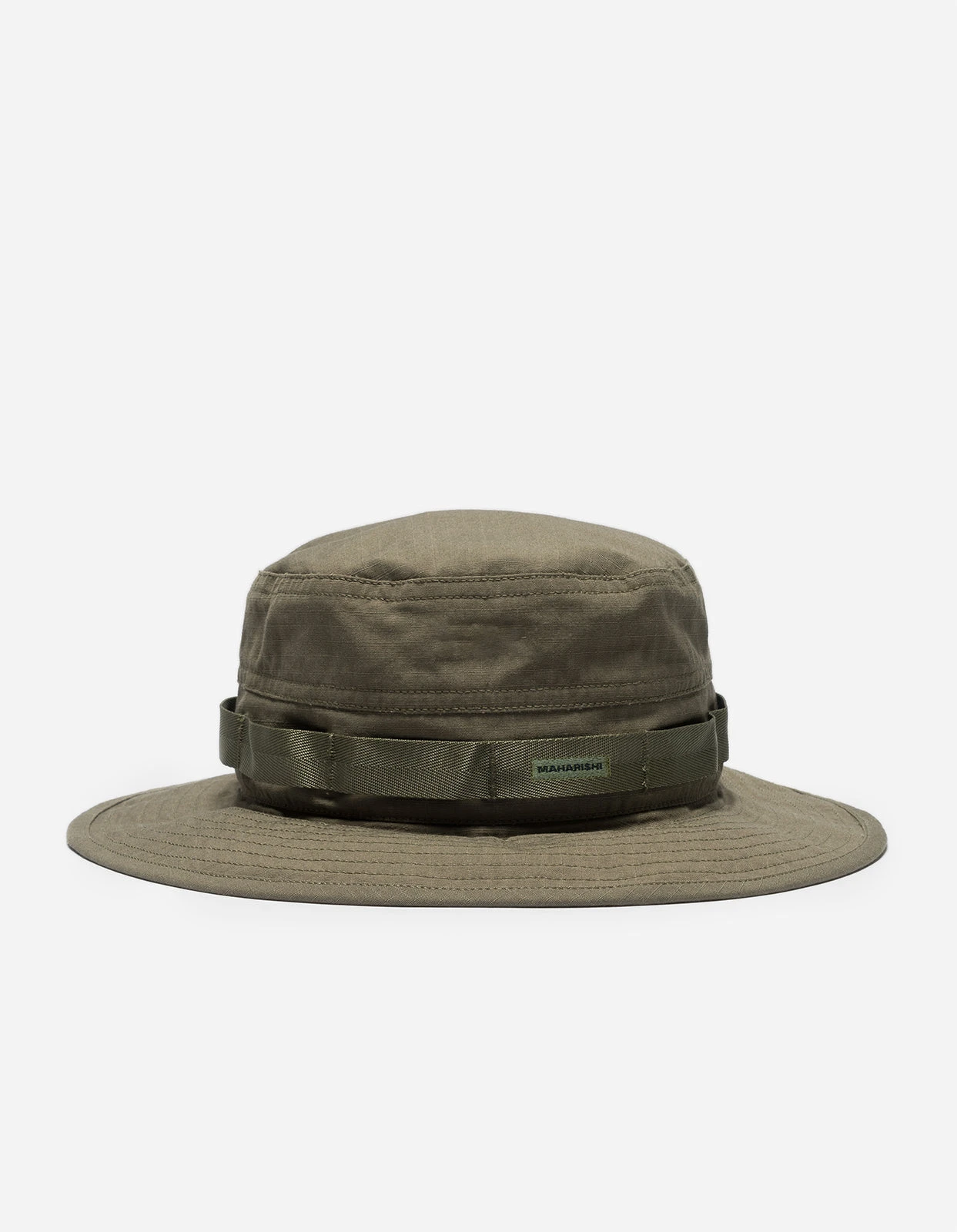 Boonie hat of durable Cordura fabric featuring a micro Maharishi nametape. Boonie hats adopted a wide brim to offer enhanced protection on battlefields in hot climates.