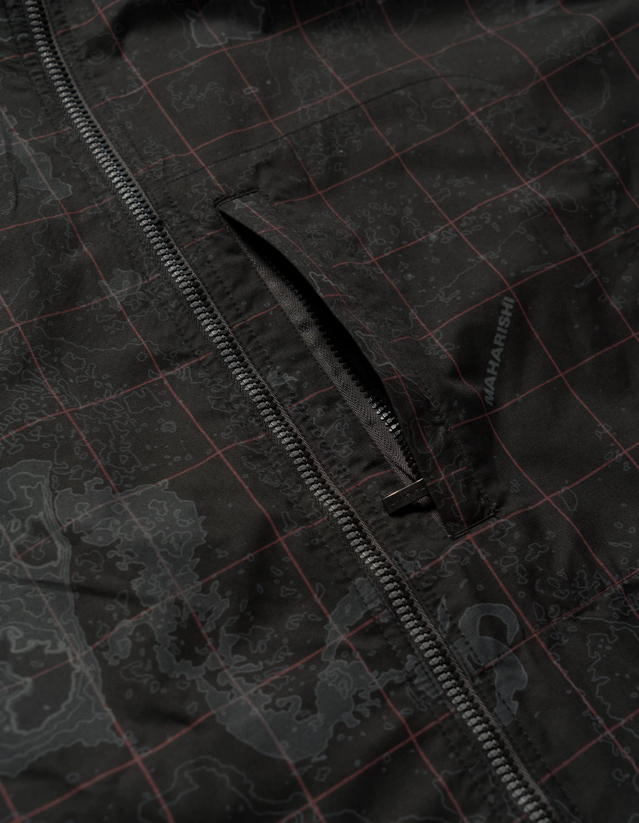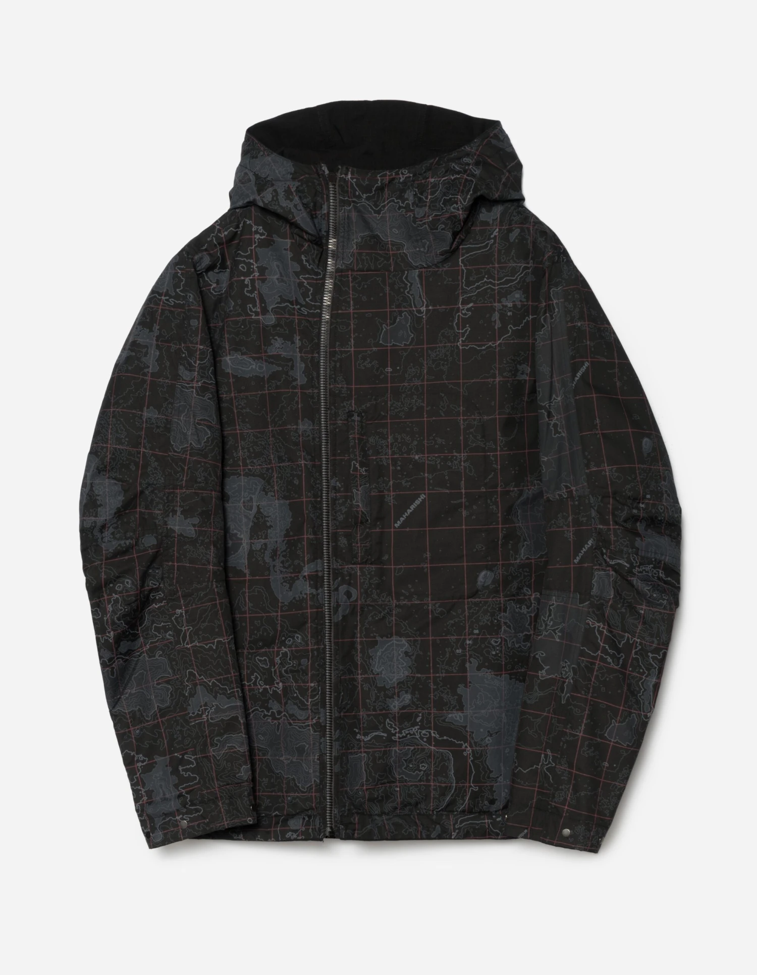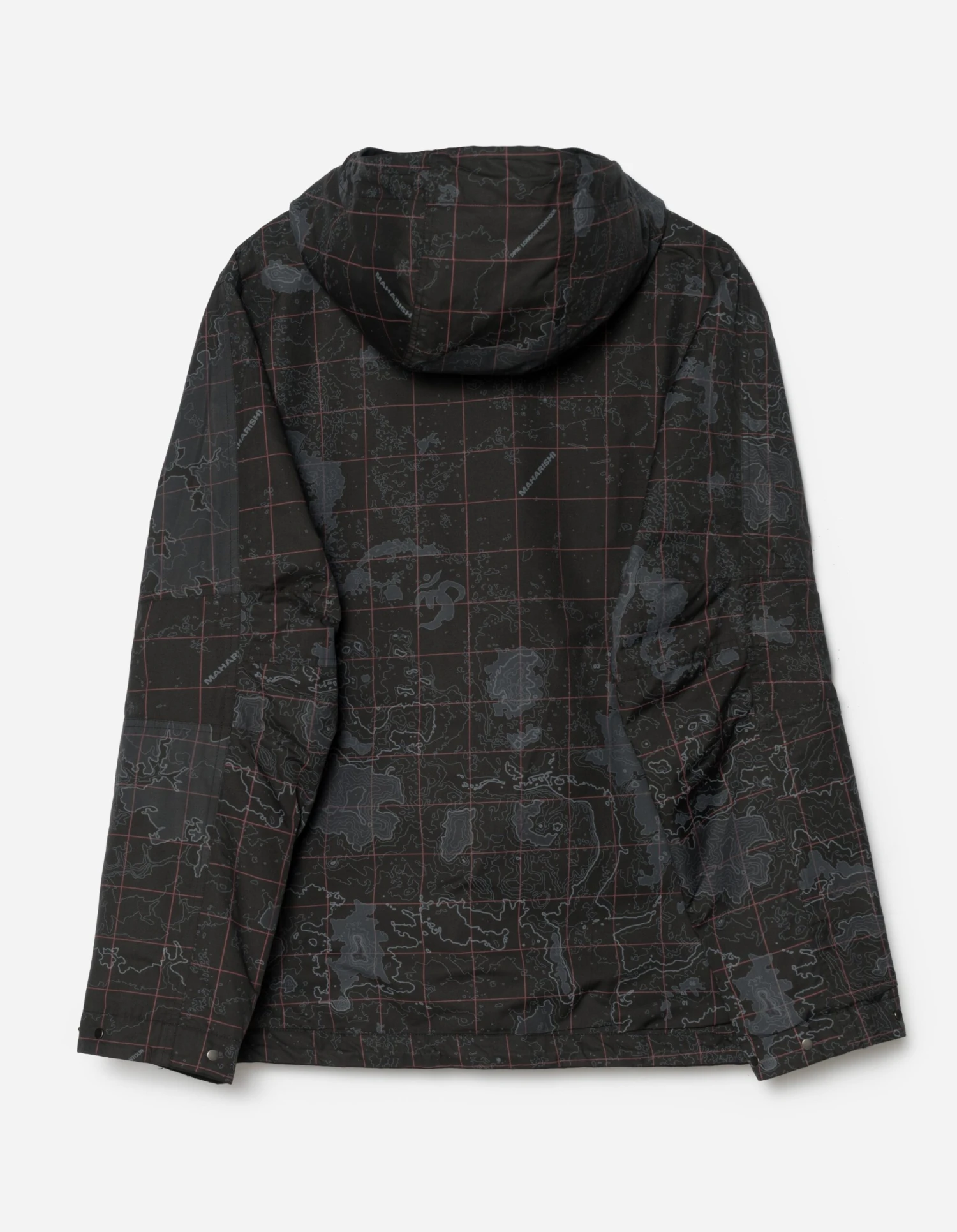 A mid-length parka of Cordura fabric with an asymmetric closure and articulated elbows. Features plenty of pockets; a large flapped cargo, hand-warmers and a secure zip on the inside. DPM: London Contour pattern on reverse. Maharishi explores topographic maps for it’s Great East/West Outdoors collection, with a topographic Ordnance Survey map of London, showing 2-3 Great Pulteney Street in the centre.