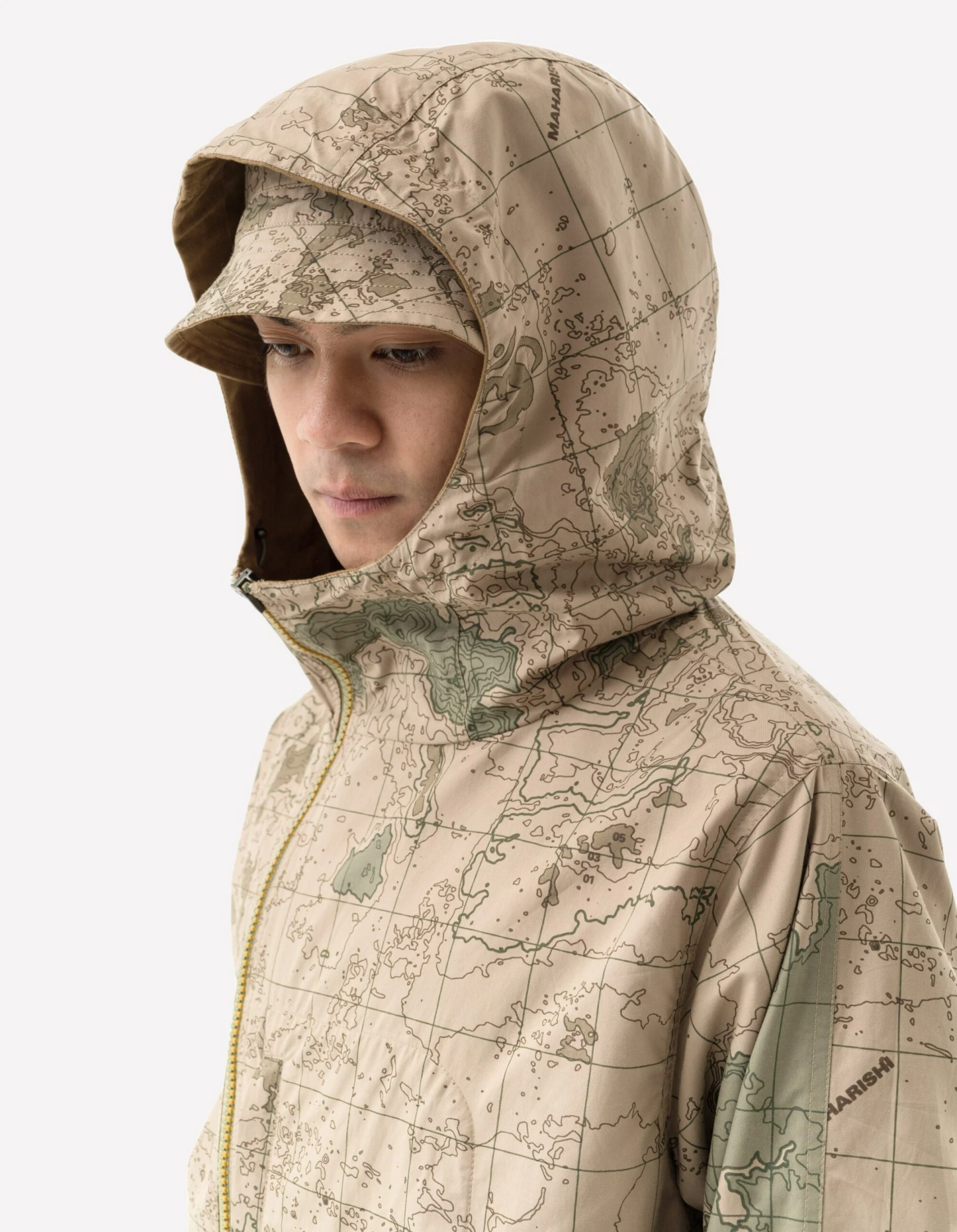 A mid-length parka of Cordura fabric with an asymmetric closure and articulated elbows. Features plenty of pockets; a large flapped cargo, hand-warmers and a secure zip on the inside. DPM: London Contour pattern on reverse. Maharishi explores topographic maps for it’s Great East/West Outdoors collection, with a topographic Ordnance Survey map of London, showing 2-3 Great Pulteney Street in the centre.