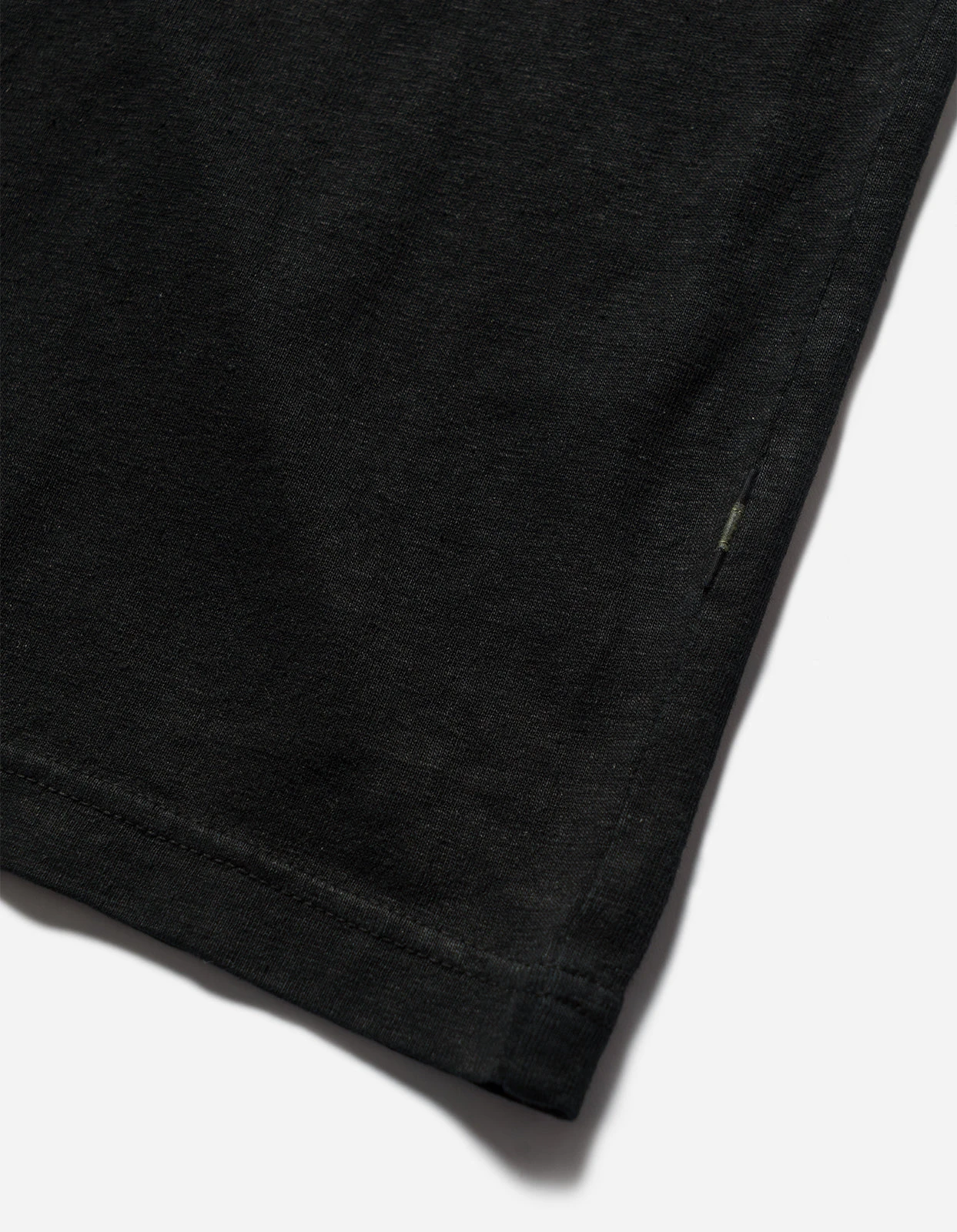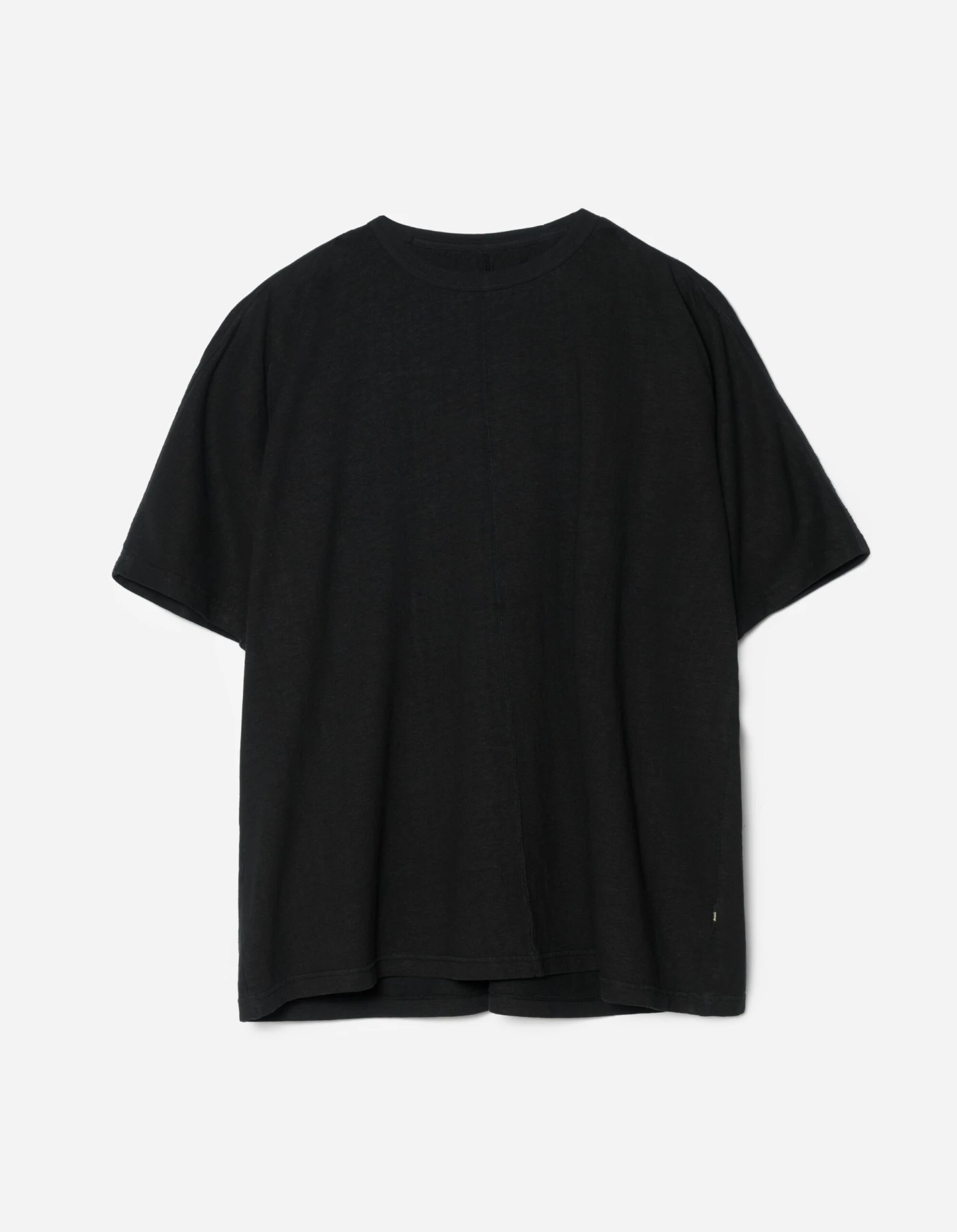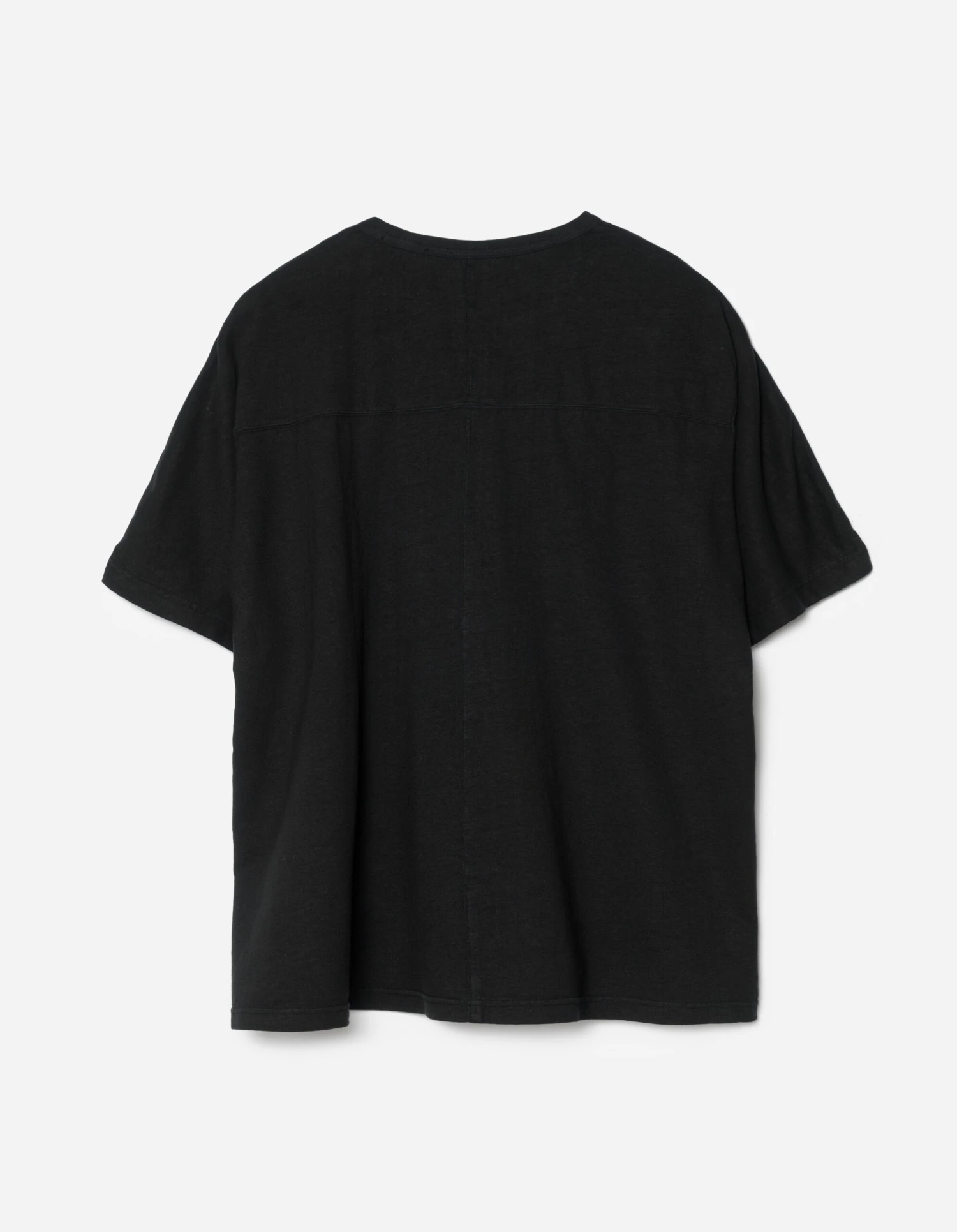 Short-sleeve t-shirt in elongated cut, constructed from an eco-conscious hemp/cotton blend and stonewashed for a soft and worn-in finish. Stylized contrast seams on both sides exposing the cut & sew nature of the garment.