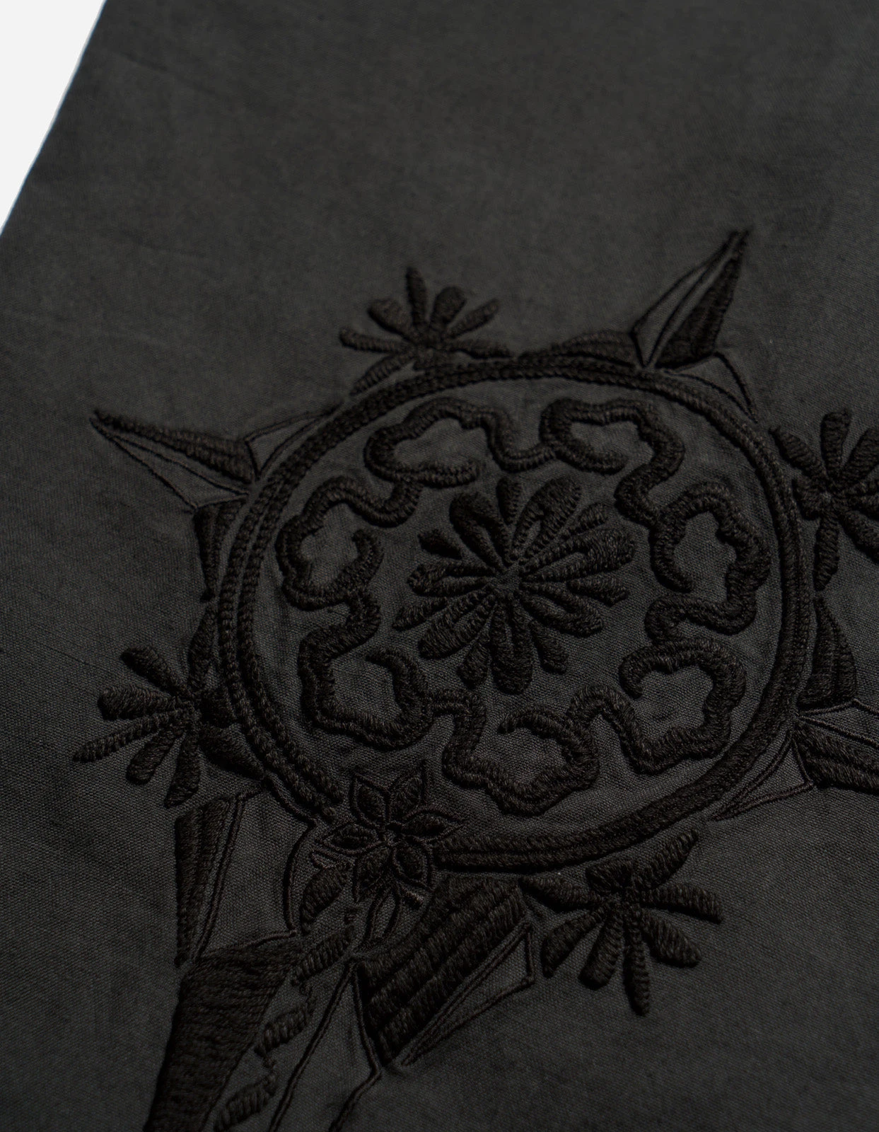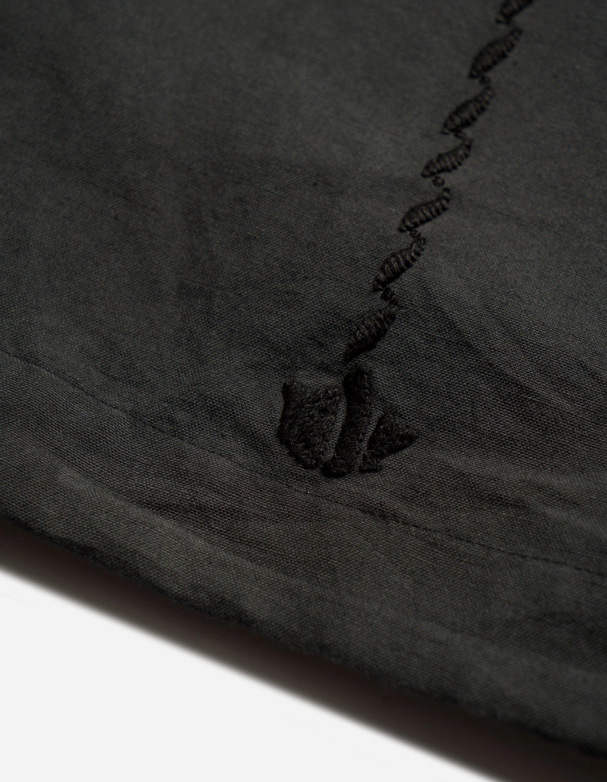 Track pants constructed from a lightweight hemp cotton. Cut to a loose fit throughout the leg to offer full mobility. High-rise with a drawcord waist for adjustment. Featuring a hand-machine-embroidered Thar compass on the lower back leg.