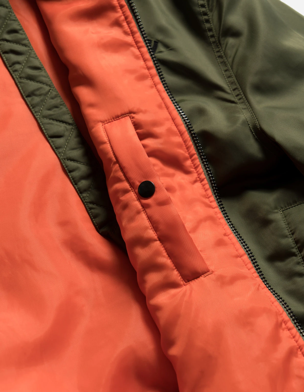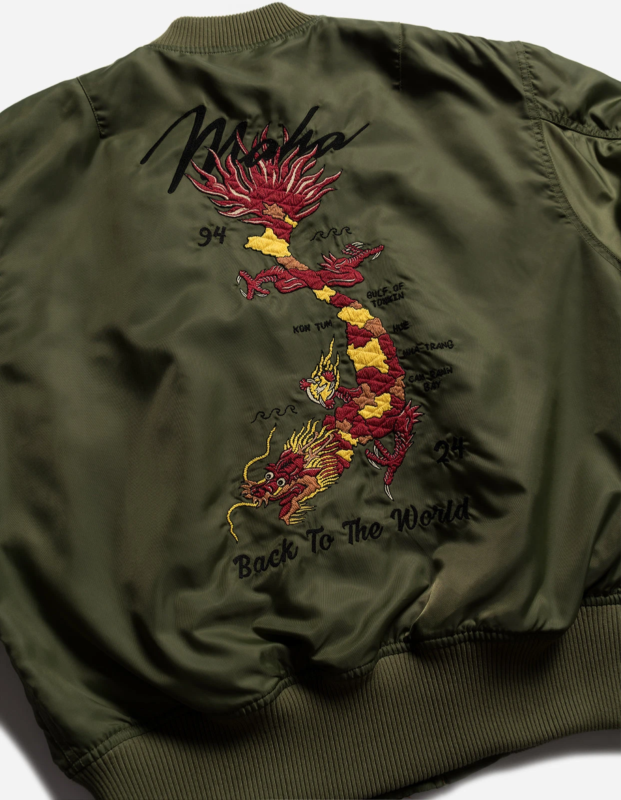 Cropped fit MA-1 flight jacket with an intricate Tour Dragon Map embroidery on the reverse. Completed with hi-vis orange lining and brass zippers.