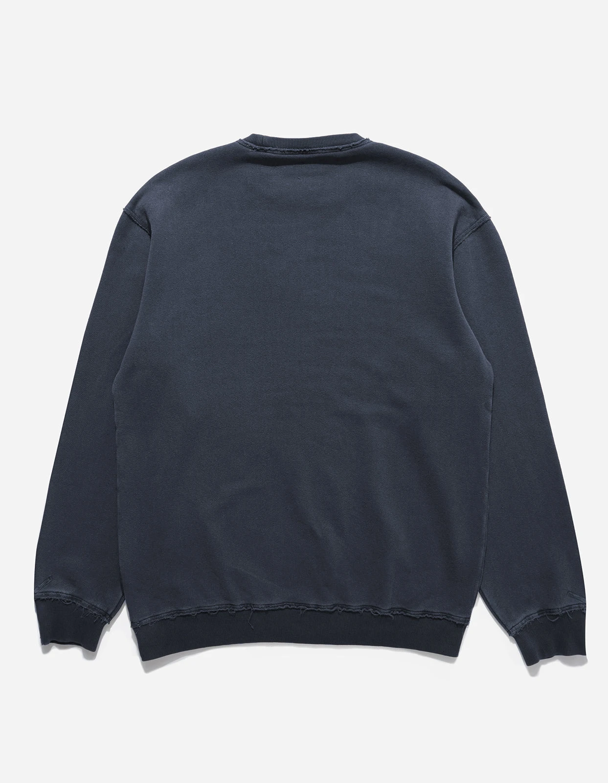 Navy overdyed hemp crew neck sweatshirt cut in a relaxed fit, raw edge seams with overlocking cuff detail.