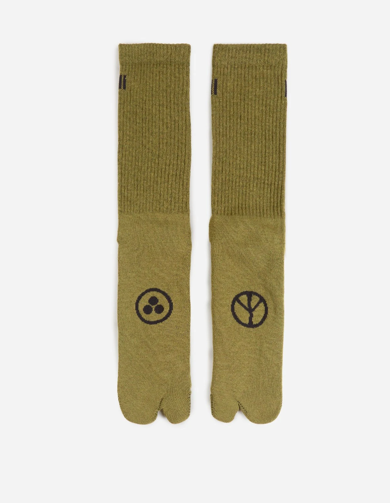 Japanese inspired split toe socks jaquarded with MAHARISHI in a MILTYPE style. Contains 3 pairs.