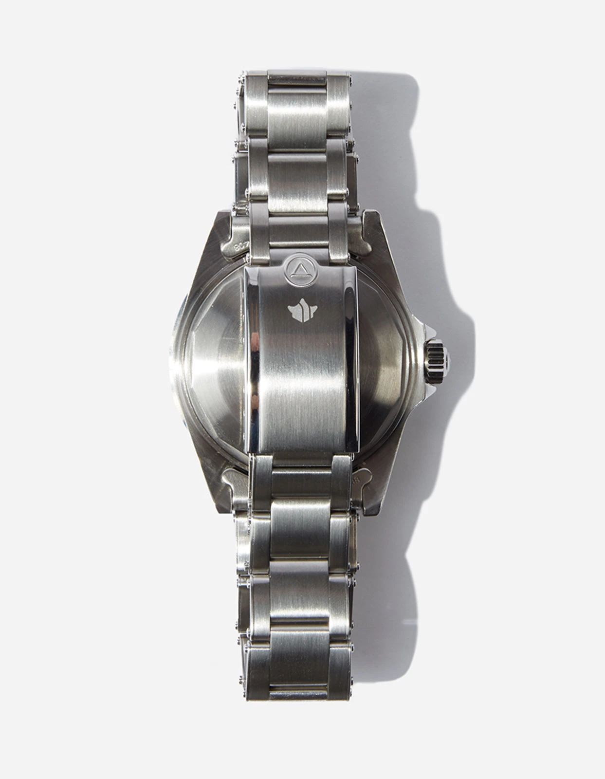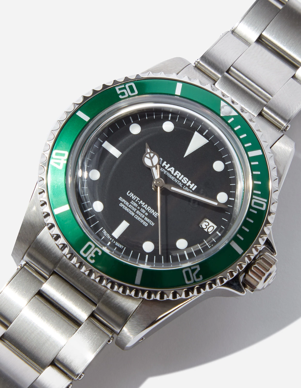 The Green Marine Watch, is based upon a classic diver design. The automatic Seiko movement in encased in a brushed stainless steel body with its distinctive green rotating bezel and CUD symbol watch hand. The watch is fitted with a stainless steel strap with folding clasp and is supplied with an additional NATO style black nylon strap, as a durable, lightweight and quick-drying option.