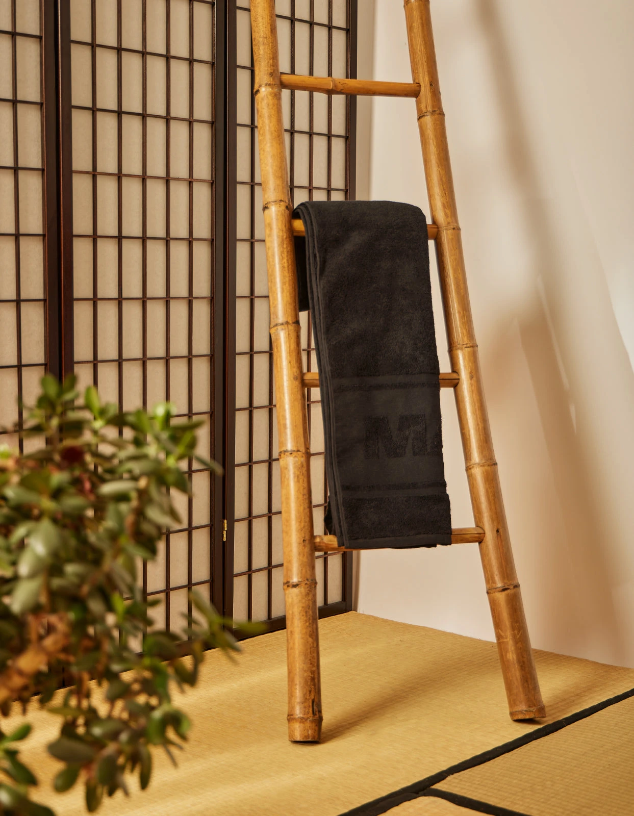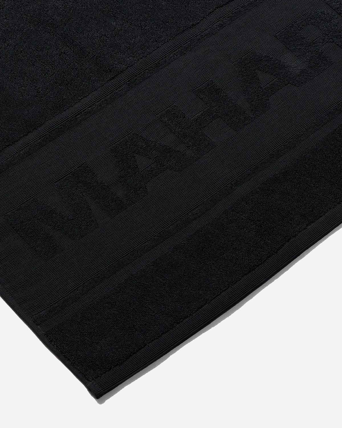 Large beach towel in black, woven in terry cloth. Featuring jacquard MAHARISHI branding on both ends.